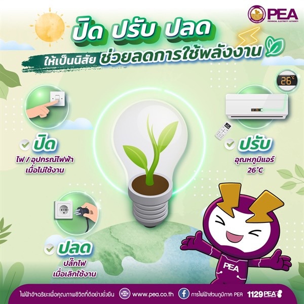 การไฟฟ้าส่วนภูมิภาค (PEA) แนะนำการใช้ไฟฟ้าช่วงฤดูร้อน เพื่อความปลอดภัยและประหยัดค่าไฟของประชาชนขอความร่วมมือประชาชนช่วยกันปรับเปลี่ยนพฤติกรรมเพื่อช่วยให้ใช้ไฟฟ้าอย่างมีประสิทธิภาพและปลอดภัย