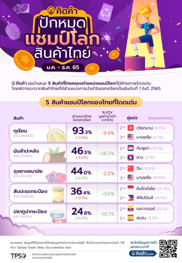 นนทบุรี 24 เม.ย.-สนค. วิเคราะห์สินค้าไทยที่ครองตำแหน่งแชมป์การค้าโลก จาก Data Analytics Dashboard ในเว็บไซต์ คิดค้า.com พบว่า ทุเรียนสด มันสำปะหลัง ถุงยางอนามัย สับปะรดกระป๋อง และปลาทูน่ากระป๋อง เป็นสินค้าที่ไทยครองตำแหน่งแชมป์โลกในปี 2565 จากส่วนแบ่งการค้าในตลาดโลกสูงเป็นอันดับที่ 1