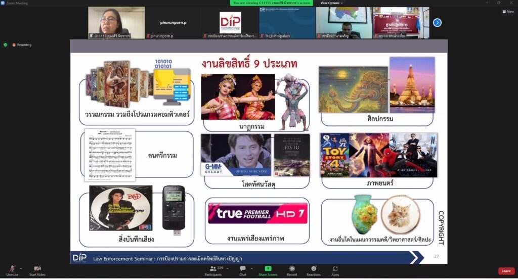 นนทบุรี 25 เม.ย.-กรมทรัพย์สินทางปัญญาจัดสัมมนาเชิงปฏิบัติการ เรื่อง การป้องปรามการละเมิดทรัพย์สินทางปัญญา โดยเชิญเจ้าหน้าที่จากกองบัญชาการตำรวจภูธร ภาค 3 กองอำนวยการรักษาความมั่นคงภายในราชอาณาจักร (กอ.รมน.) กรมศุลกากร และกรมสอบสวนคดีพิเศษ กว่า 200 คนเข้าร่วม เพื่อเพิ่มพูนความรู้และเทคนิคจากผู้เชี่ยวชาญสำหรับประยุกต์ใช้ในการปฏิบัติหน้าที่ เมื่อวันที่ 25 เมษายน 2566 ผ่านระบบ Zoom