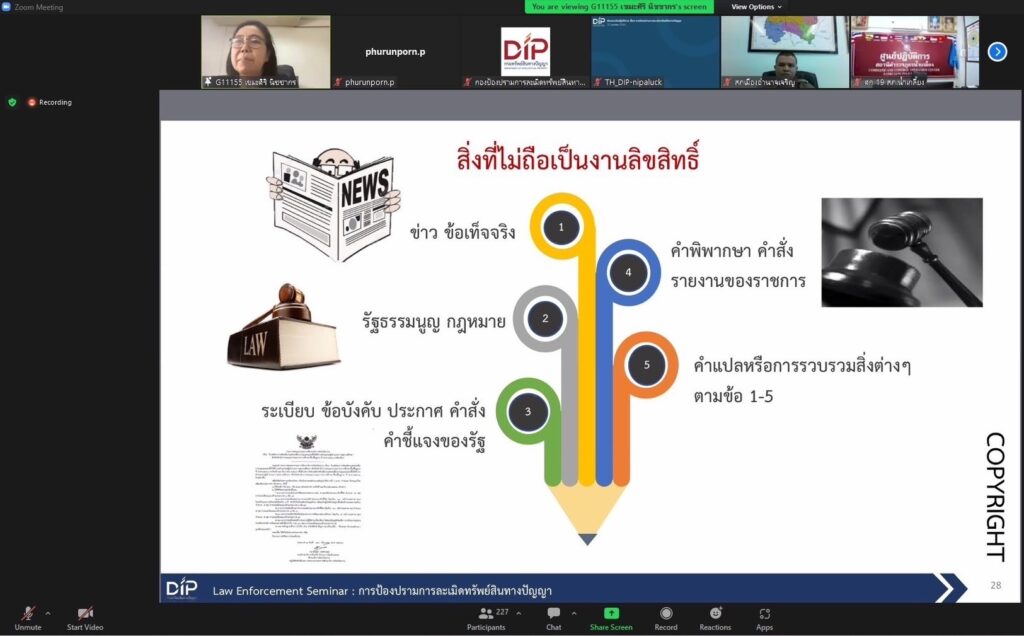 กรมทรัพย์สินทางปัญญาจึงจัดงานสัมมนาเชิงปฏิบัติการผ่านระบบออนไลน์ เรื่อง การป้องปรามการละเมิดทรัพย์สินทางปัญญา โดยได้รับเกียรติจาก พลตำรวจตรี พุฒิเดช บุญกระพือ ผู้บังคับการปราบปรามการกระทำความผิดเกี่ยวกับอาชญากรรมทางเศรษฐกิจ ร่วมกล่าวปาฐกถาพิเศษและมอบนโยบายการบูรณาการด้านการป้องปรามการละเมิดทรัพย์สินทางปัญญา และวิทยากรผู้ทรงคุณวุฒิจากสำนักงานอัยการสูงสุด กรมทรัพย์สินทางปัญญา สำนักงานตำรวจแห่งชาติ และภาคเอกชนเจ้าของสิทธิในทรัพย์สินทางปัญญา ร่วมบรรยายความรู้ในหัวข้อต่างๆ อาทิ แนวคิดทฤษฎีกฎหมายทรัพย์สินทางปัญญา กลยุทธ์การสอบสวนคดีละเมิดทรัพย์สินทางปัญญา กระบวนการพิจารณาคดีของพนักงานอัยการ และแนวทางในการตรวจสอบสินค้าของจริงของปลอม เพื่อให้เจ้าหน้าที่ตำรวจและเจ้าหน้าที่จากหน่วยงานบังคับใช้กฎหมายที่เกี่ยวข้อง สามารถปฏิบัติงานได้อย่างถูกต้อง เป็นธรรมทั้งต่อเจ้าของสิทธิ ผู้ใช้งานทรัพย์สินทางปัญญา และประชาชนทั่วไป