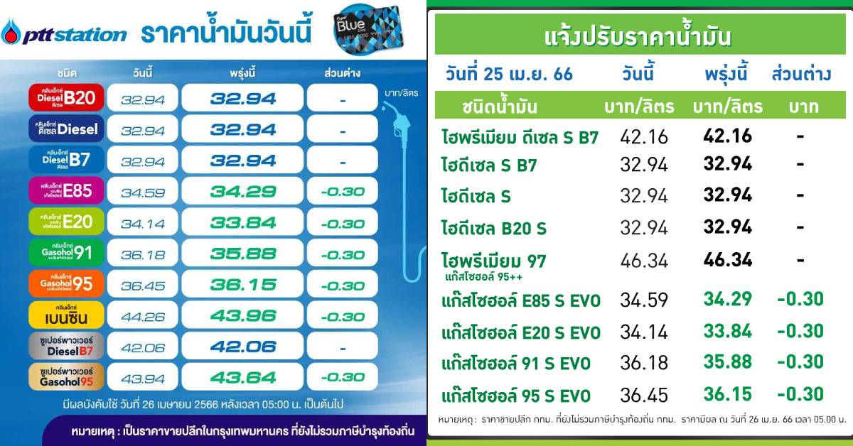 กทม. 25 เม.ย.-PTT Station บางจาก ปรับราคาขายปลีกน้ำมันกลุ่มเบนซินและแก๊สโซฮอล์ทุกชนิดลง 30 สตางค์/ลิตร ส่วนกลุ่มดีเซลคงเดิม มีผล 26 เม.ย. 2566 เวลา 05.00 น. เป็นต้นไป