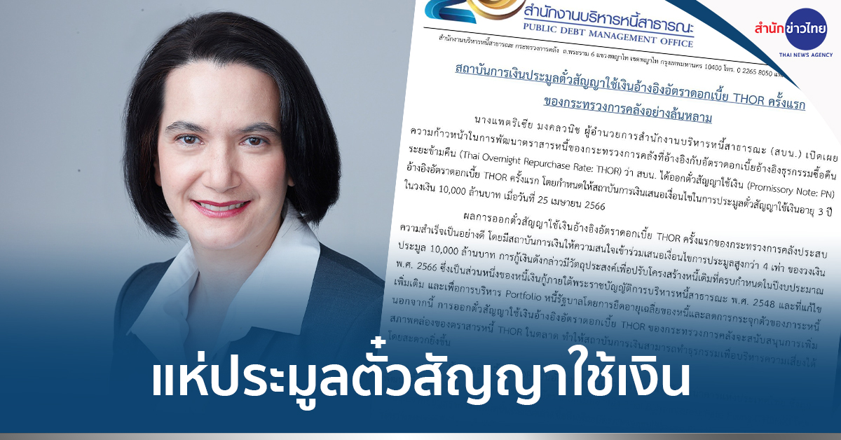 นางแพตริเซีย มงคลวนิช ผู้อำนวยการสำนักงานบริหารหนี้สาธารณะ (สบน.) เปิดเผยว่า เพื่อพัฒนาตราสารหนี้ของกระทรวงการคลัง ด้วยการอ้างอิงกับอัตราดอกเบี้ยอ้างอิงธุรกรรมซื้อคืนระยะข้ามคืน (Thai Overnight Repurchase Rate: THOR) สบน. จึงได้ออกตั๋วสัญญาใช้เงิน (Promissory Note: PN) อ้างอิงอัตราดอกเบี้ย THOR เป็นครั้งแรก โดยกำหนดให้สถาบันการเงิน ยื่นประมูลตั๋วสัญญาใช้เงินอายุ 3 ปี ในวงเงิน 10,000 ล้านบาท เมื่อวันที่ 25 เมษายน 2566