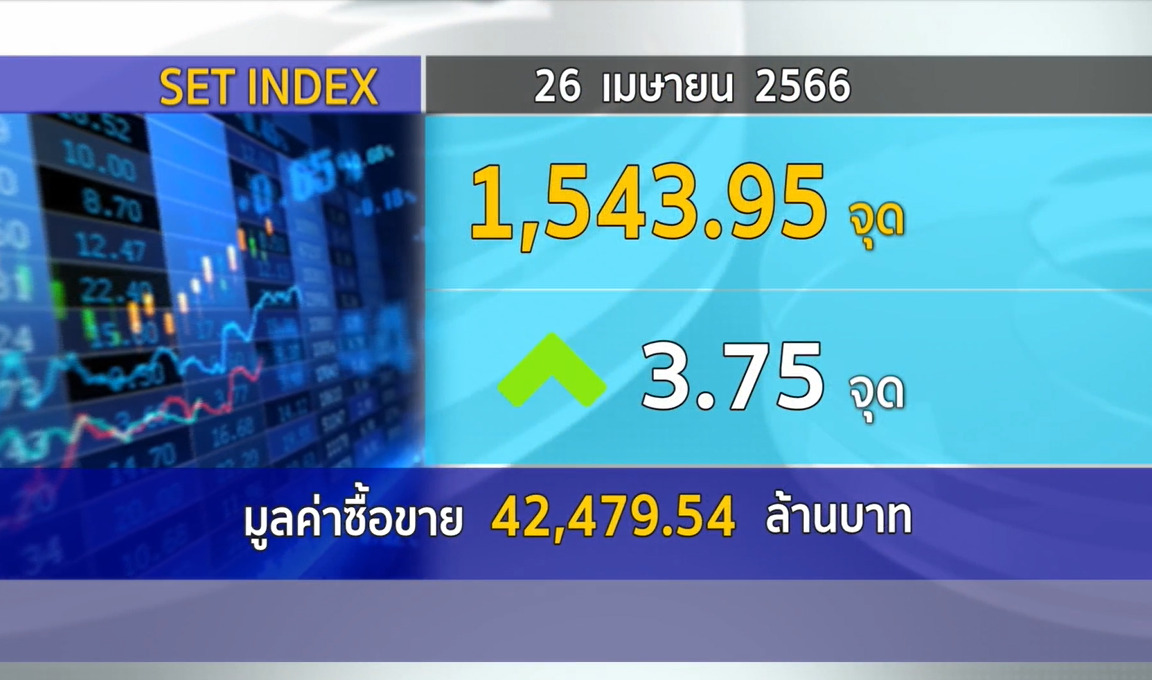 กทม. 26 เม.ย.-SET ปิดวันนี้ที่ 1,543.95 จุด เพิ่มขึ้น 3.75 จุด (+0.24%) มูลค่าการซื้อขาย 42,479.54 ล้านบาท