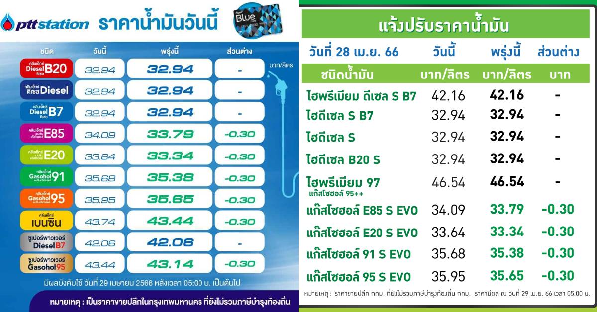 กทม. 28 เม.ย.-PTT Station บางจาก ปรับราคาขายปลีกน้ำมันกลุ่มเบนซินและแก๊สโซฮอล์ทุกชนิดลง 30 สตางค์/ลิตร ส่วนกลุ่มดีเซลคงเดิม มีผล 29 เม.ย.2566 เวลา 05.00 น. เป็นต้นไป