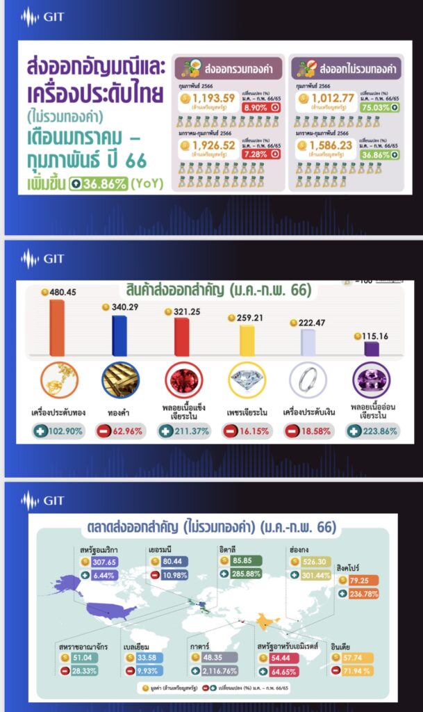 นนทบุรี 30 เม.ย.-ผู้อำนวยการสถาบันวิจัยและพัฒนาอัญมณีและเครื่องประดับแห่งชาติ (องค์การมหาชน) หรือ (GIT) ย้ำแผนเร่งผลักดันการส่งออกสินค้าอัญมณีและเครื่องประดับให้หนักขึ้นโดยนำผู้ประกอบการ ขยายตลาดในช่วงที่เหลือของปีนี้ ผ่านงานแสดงสินค้าต่างๆ ควบคู่กับการสร้างมาตรฐานสินค้าเพื่อสร้างความเชื่อมั่นให้กับผู้ซื้อทั่วโลกตั้งเป้าผลักดันการส่งออกอัญมณีและเครื่องประดับปีนี้ให้ขยายตัวเป็นบวกได้ต่อเนื่อง ปลื้มสินค้ากลุ่มนี้ส่งออกเป็นอันดับ 3 ของไทย