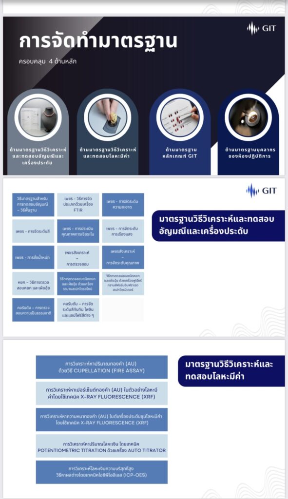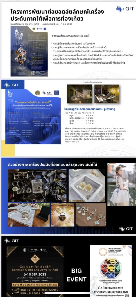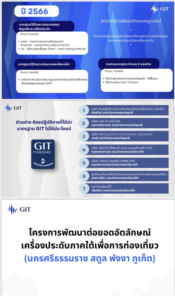 นายสุเมธ ประสงค์พงษ์ชัย ผู้อำนวยการสถาบันวิจัยและพัฒนาอัญมณีและเครื่องประดับแห่งชาติ (องค์การมหาชน) หรือ GITกล่าวว่าในปี 2566 นี้ ยังนำหลักคิด BCG มาใช้พัฒนาผู้ประกอบการ ตั้งแต่ต้นน้ำ – ปลายน้ำ ผ่านหลายโครงการทั้งการประกวดออกแบบเครื่องประดับ ที่ใช้วัสดุจากธรรมชาติ และโครงการพัฒนาต่อยอดอัตลักษณ์เครื่องประดับภาคใต้เพื่อการท่องเที่ยว (เสน่ห์ใต้) ที่เน้นในเรื่องของการนำวัสดุพื้นถิ่น ท้องถิ่น ให้เกิดชิ้นงานใหม่ๆ ที่ตอบโจทย์ความต้องการของโลก โดยจะยังคงมุ่งเน้น มาตรฐาน GIT STANDARD ซึ่งผู้ประกอบการ และเอกชนหลายแห่งเริ่มใช้มาตรฐานนี้กันมากขึ้น ปัจจุบันมีรายการมาตรฐานวิธีวิเคราะห์และทดสอบอัญมณี ที่ประกาศใช้แล้ว 22 ขอบข่าย ซึ่งปีนี้ เตรียมจะเพิ่มอีก 3 ขอบข่าย ได้แก่ มรกต มุก และการตรวจค่าบริสุทธิ์ของเงิน และยังมีมาตรฐานด้านจรรยาบรรณในการทำธุรกิจด้วย