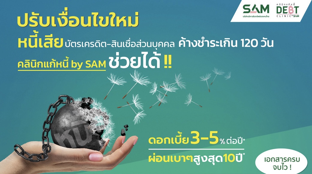 กรุงเทพฯ 2 พ.ค.- “คลินิกแก้หนี้ by SAM” ปรับเงื่อนไขใหม่ ช่วยคนเป็นหนี้เสียค้างชำระเกิน 120 วัน เข้าร่วมโครงการได้ หวังช่วยลดภาระหนี้ให้ประชาชน พร้อม 3 ทางเลือกผ่อนชำระหนี้ตามความสามารถ ดอกเบี้ยต่ำ 3-5% และผ่อนนานสูงสุดถึง 10 ปี