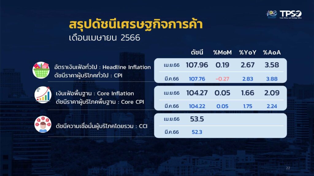 นายพูนพงษ์ นัยนาภากรณ์ ผู้อำนวยการสำนักงานนโยบายและยุทธศาสตร์การค้า หรือ สนค เปิดเผยว่า ดัชนีราคาผู้บริโภคของไทย เดือนเมษายน 2566 เท่ากับ 107.96 เมื่อเทียบกับเดือนเดียวกันของปีก่อน ซึ่งเท่ากับ 105.15 ส่งผลให้อัตราเงินเฟ้อทั่วไป สูงขึ้นร้อยละ 2.67 ชะลอตัวต่อเนื่องเป็นเดือนที่ 4 และต่ำสุดในรอบ 16 เดือน สาเหตุสำคัญมาจากการลดลงของราคาน้ำมันเชื้อเพลิง และสินค้าในหมวดอาหารที่ราคาชะลอตัว ประกอบกับฐานราคาในเดือนเมษายน 2565 ที่ใช้คำนวณเงินเฟ้ออยู่ระดับสูง