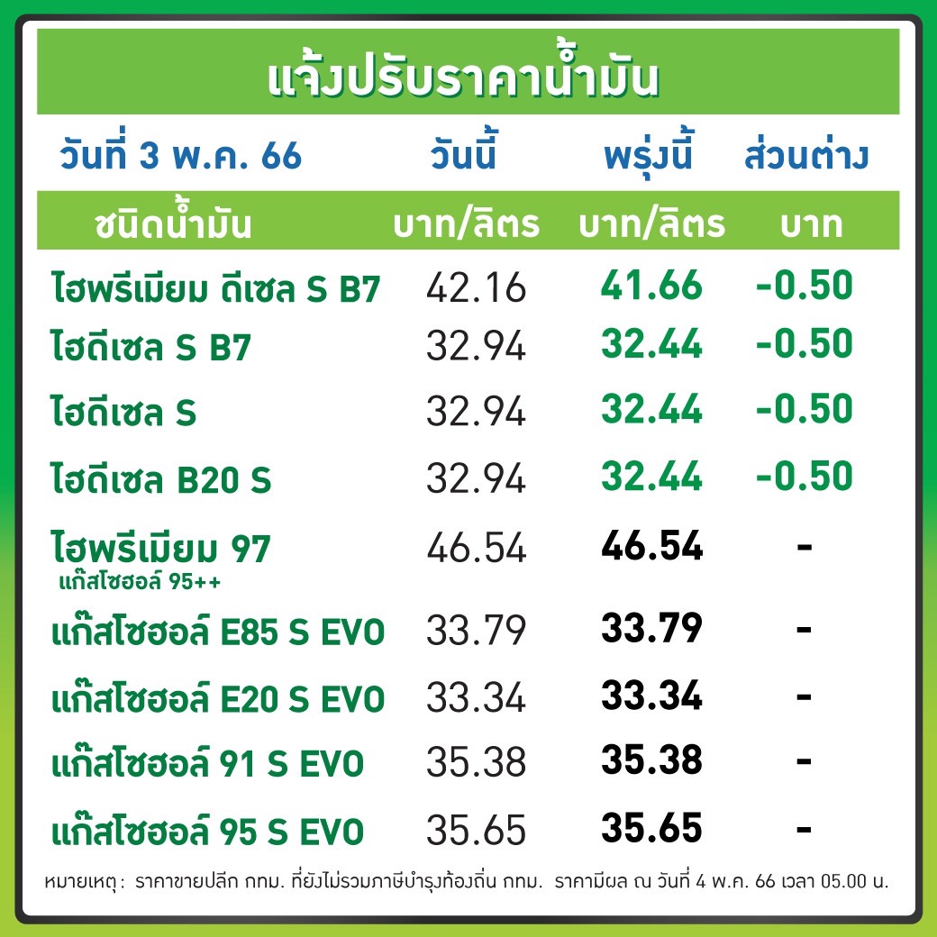PTT Station ปรับราคาขายปลีกน้ำมันกลุ่มดีเซลทุกชนิดลง 0.50 บาท/ลิตร ส่วนกลุ่มเบนซินและแก๊สโซฮอล์ คงเดิม มีผล 4 พ.ค.66 เวลา 05.00 น. เป็นต้นไป โดยราคาขายปลีกจะเป็นดังนี้ ULG = 43.44, GSH95 = 35.65, E20 = 33.34, GSH91 = 35.38, E85 = 33.79, พรีเมี่ยม GSH95 = 43.14, HSD-B7 = 32.44, HSD-B10 = 32.44, HSD-B20 = 32.44, พรีเมี่ยมดีเซล B7 = 41.56 บาท/ลิตร โดยราคาขายปลีกข้างต้นยังไม่รวมภาษีบำรุงกรุงเทพมหานคร