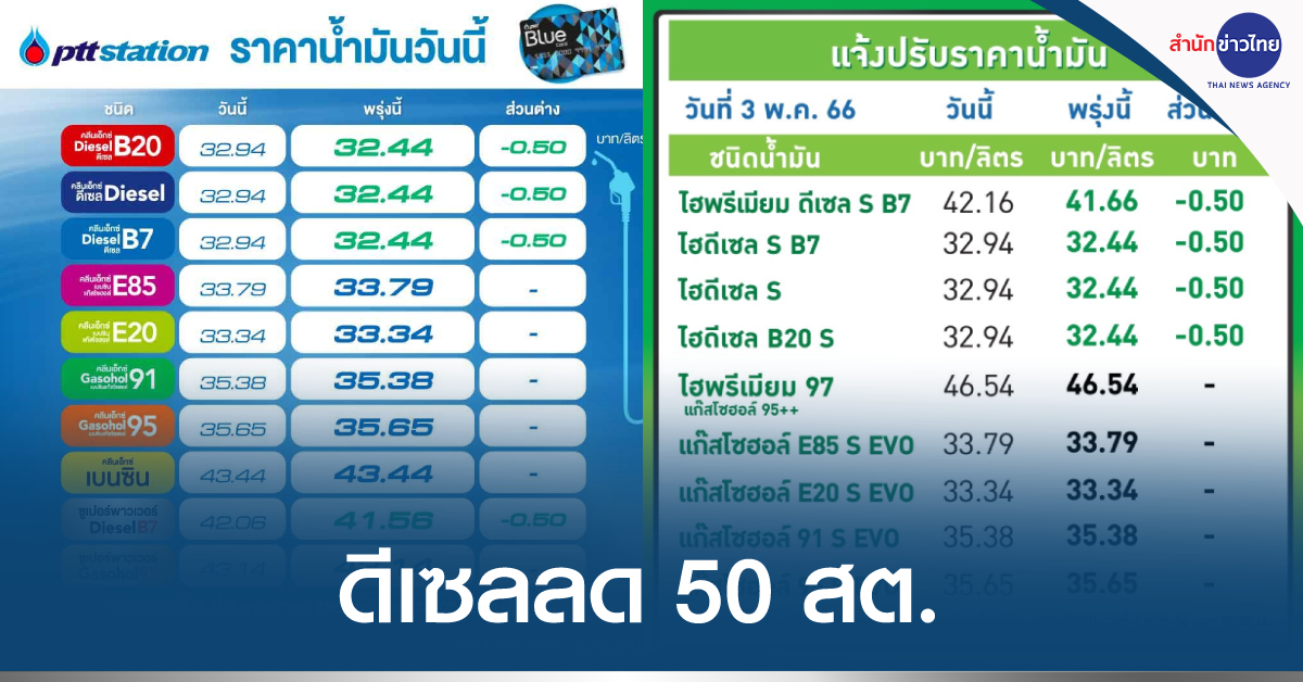 กรุงเทพฯ 3 พ.ค. – ผู้ค้าน้ำมันปรับลดราคาขายปลีกน้ำมันกลุ่มดีเซลทุกชนิดลง 50 สตางค์/ลิตร ส่วนกลุ่มเบนซิน-แก๊สโซฮอล์ คงเดิม มีผลพรุ่งนี้ (4 พ.ค.66) ตั้งแต่เวลา 05.00 น. เป็นต้นไป