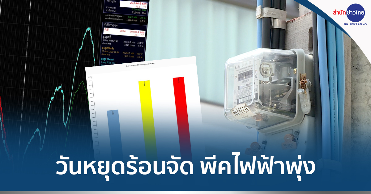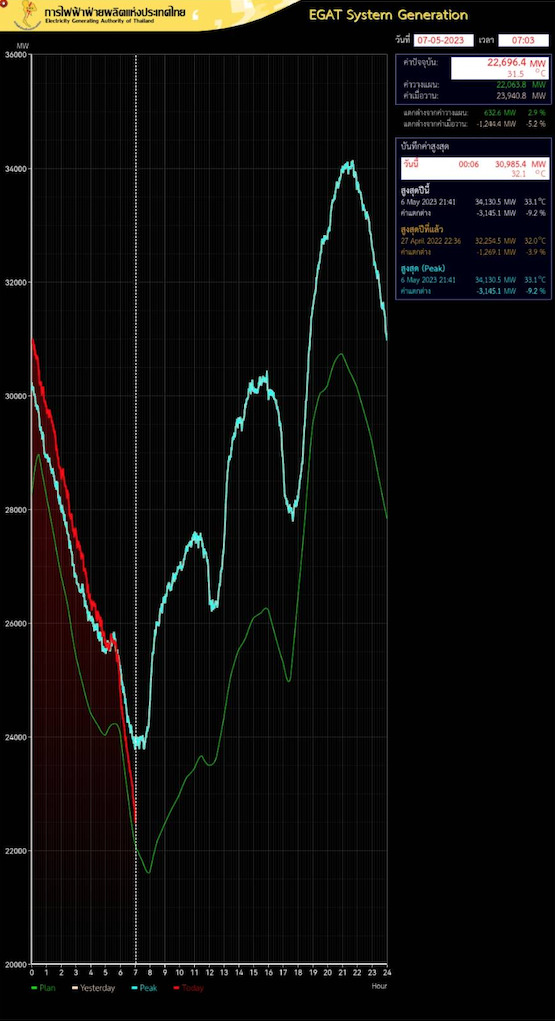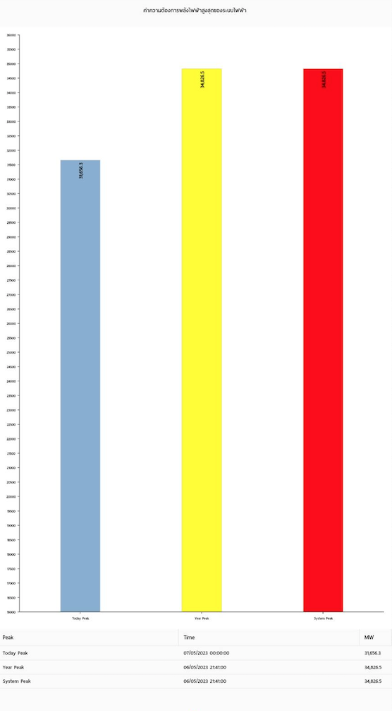 การไฟฟ้าฝ่ายผลิตแห่งประเทศไทย(กฟผ.) และสำนักงานคณะกรรมการกำกับกิจการพลังงาน(กกพ.) รายงานว่าเมื่อวันที่ 6 พฤษภาคม 2566 เวลา 21:41 น. Peak ระบบ กฟผ. ทำลายสถิติที่ 34,130.5 MW