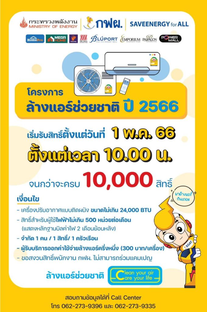นายบุญญนิตย์ วงศ์รักมิตร ผู้ว่าการ การไฟฟ้าฝ่ายผลิตแห่งประเทศไทย (กฟผ.) กล่าวว่า ฤดูร้อนนี้ กฟผ. ได้ร่วมกับพันธมิตรจัดทำโครงการรณรงค์การประหยัดพลังงานเพื่อเพิ่มประสิทธิภาพการใช้พลังงาน ลดภาระค่าไฟฟ้าให้กับผู้ใช้ไฟฟ้า เช่นโครงการล้างแอร์ช่วยชาติ (Clean your air, Care your life) . ร่วมกับห้างสรรพสินค้าและผู้ค้าปลีกบริการล้างแอร์ให้แก่ประชาชนครึ่งราคา จำนวน 10,000 สิทธิ สำหรับผู้ใช้ไฟฟ้าไม่เกิน 500 หน่วยต่อเดือน โดยประชาชนจ่ายค่าล้างแอร์ 300 บาท จำกัดครัวเรือนละ 1 สิทธิต่อการล้างแอร์ 1 เครื่อง