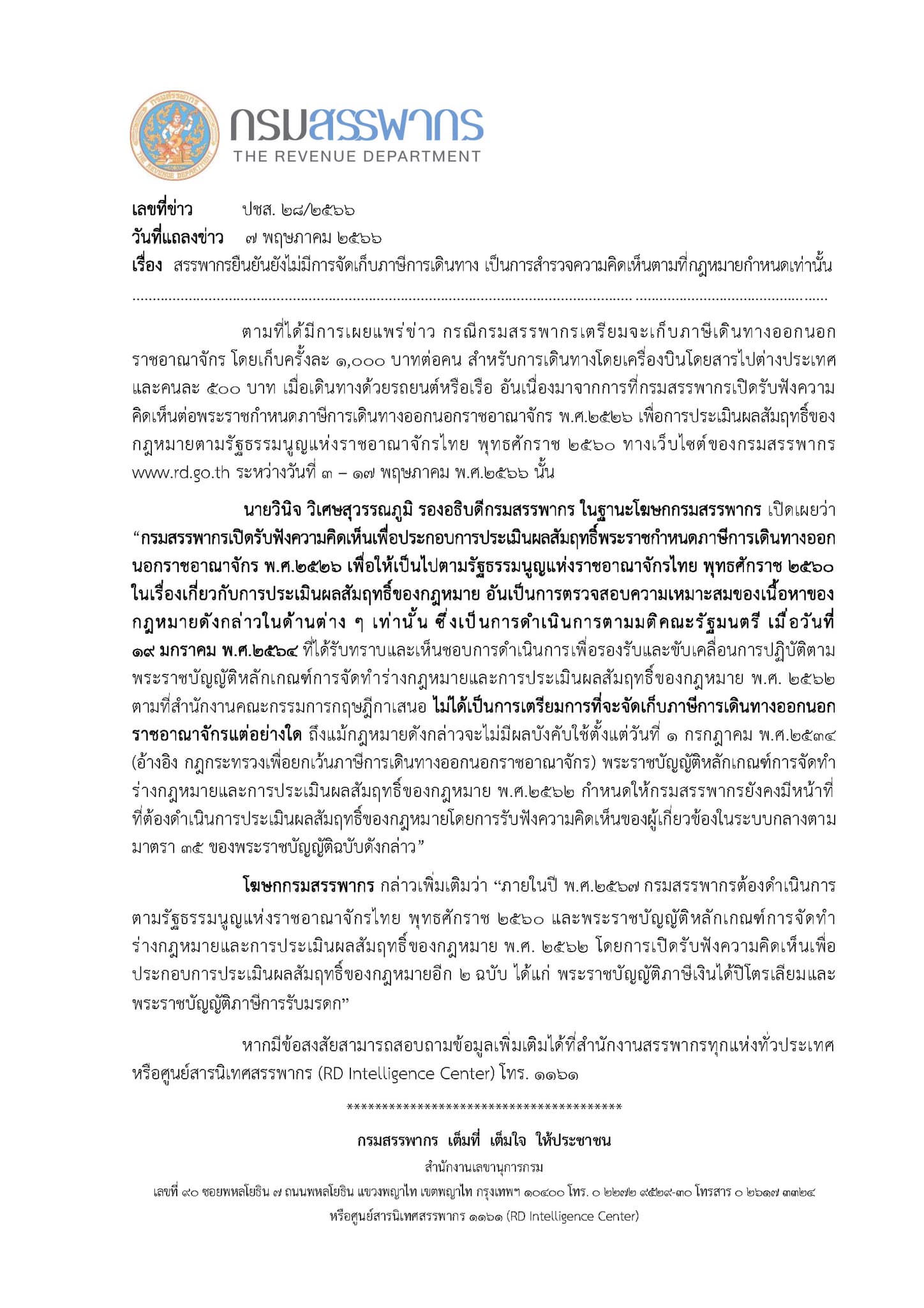 นายวินิจ วิเศษสุวรรณภูมิ รองอธิบดีกรมสรรพากร ในฐานะโฆษกกรมสรรพากร เปิดเผยว่า ตามที่ได้มีการเผยแพร่ข่าว กรณีกรมสรรพากรเตรียมจะเก็บภาษีเดินทางออกนอกราชอาณาจักร โดยเก็บครั้งละ 1,000 บาทต่อคน สำหรับการเดินทางโดยเครื่องบินโดยสารไปต่างประเทศ และคนละ 500 บาท เมื่อเดินทางด้วยรถยนต์หรือเรือ อันเนื่องมาจากการที่กรมสรรพากรเปิดรับฟังความคิดเห็นต่อพระราชกำหนดภาษีการเดินทางออกนอกราชอาณาจักร พ.ศ. 2526 เพื่อการประเมินผลสัมฤทธิ์ของกฎหมาย ตามรัฐธรรมนูญแห่งราชอาณาจักรไทย พุทธศักราช 2560 ทางเว็บไซต์ของกรมสรรพากร www.rd.go.th ระหว่างวันที่ 3-17 พฤษภาคม พ.ศ. 2566 นั้น