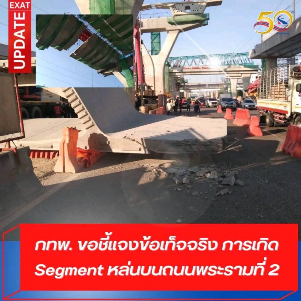 สาเหตุเกิดจากบาร์ที่ใช้ยึดระหว่างชุด Lifting Frame ขาด จึงทำให้ชิ้นงาน Segment หล่นลงพื้น จากการสอบถามผู้ที่อยู่ในที่เกิดเหตุ แจ้งว่ามีเศษคอนกรีตจากก้อน Segment กระเด็นโดนรถยนต์ ทำให้รถที่สัญจรผ่านได้รับความเสียหาย 4 คัน ผิวจราจรชำรุด ทางเจ้าหน้าที่โครงการอยู่ระหว่างดำเนินการเข้าประสานงานรับผิดชอบความเสียหายทุกราย