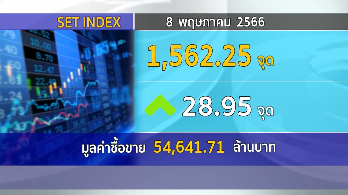 กทม. 8 พค.-SET ปิดวันนี้ที่ 1,562.25 จุด เพิ่มขึ้น 28.95 จุด (+1.89%) มูลค่าการซื้อขาย 54,641.71 ล้านบาท