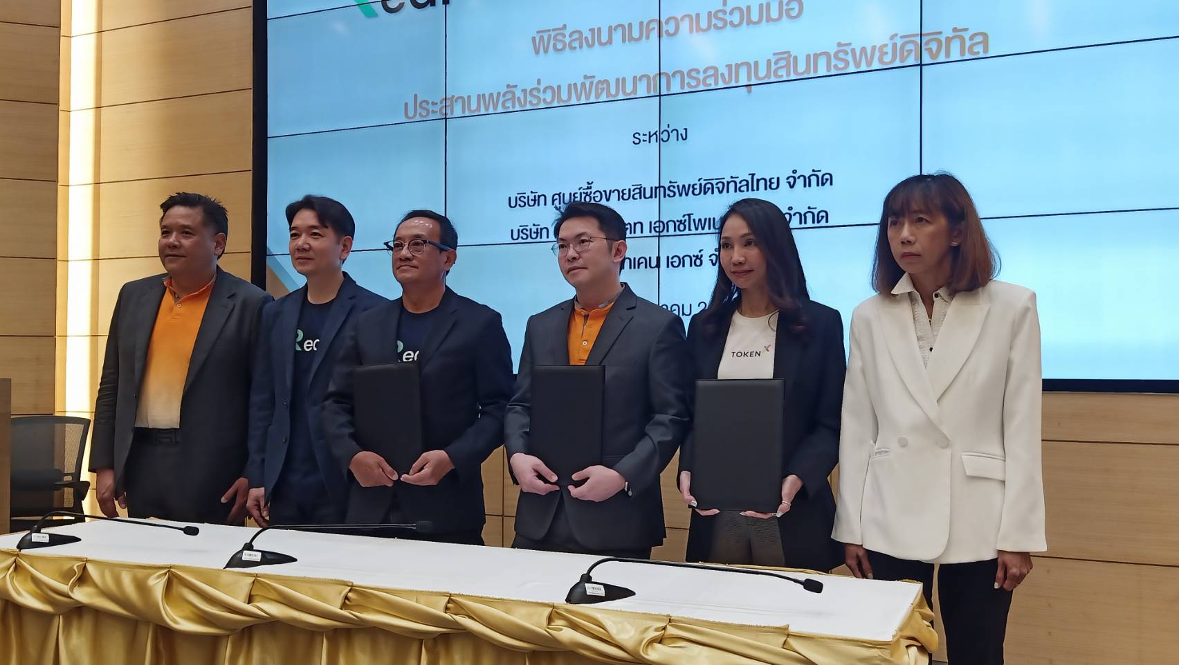 นายแมนพงศ์ เสนาณรงค์ ประธานกรรมการ บริษัท ศูนย์ซื้อขายสินทรัพย์ดิจิทัลไทย จำกัด (TDX) พร้อมด้วย ดร. วีรพงษ์ ชุติภัทร์ ประธานเจ้าหน้าที่บริหาร บริษัท เรียล เอสเตท เอกซ์โพเนนเชียล จำกัด และนางสาวจิตตินันท์ ชาติสีหราช ประธานเจ้าหน้าที่บริหาร บริษัท โทเคน เอกซ์ จำกัด หรือ Token X บริษัทภายใต้กลุ่มเอสซีบี เอกซ์ (SCBX Group) ร่วมกันทำพิธีลงนามความร่วมมือ ประสานพลังร่วมพัฒนาการลงทุนสินทรัพย์ดิจิทัล