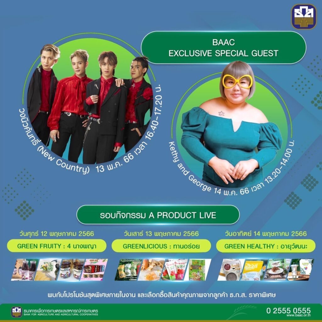 ที่สำคัญคือ กิจกรรม BAAC LIVE เสวนา Green Finance for Green Living ที่จะมีการพูดคุยในประเด็นการช่วยลดปัญหาโลกร้อนอย่างยั่งยืน ด้วยการปลูกต้นไม้ เพื่อกักเก็บคาร์บอน การสร้างมูลค่าเพิ่มให้ที่ดินและการดูแลสิ่งแวดล้อม โดยคุณปรีชา หงอกสิมมา กรรมการธนาคารต้นไม้บ้านท่าลี่ คุณเพยาว์ แสงประไพ ประธานธนาคารต้นไม้บ้านบางเสด็จ และคุณผลึก อาจหาญ ผู้อำนวยการฝ่ายพัฒนาลูกค้าและชุมชน ธ.ก.ส. กิจกรรม A-Product LIVE จำหน่ายผลิตภัณฑ์คุณภาพจากเกษตรกรลูกค้าในราคาพิเศษ อาทิ ผลิตภัณฑ์ Green Fruity set : 4 นางพญา Greenlicious set : ทานอร่อย และ Green Healthy set : อายุวัฒนะ ผ่าน Facebook page : ธกส บริการด้วยใจ และ Youtube : BAAC Thailand และมินิคอนเสิร์ตจาก วงนิวคันทรี่ (New Country) โดยร่วมสนุกกันได้ที่บูธ ธ.ก.ส. ในวันที่ 13 พฤษภาคม 2565 เวลา 16.40 – 17.20 น. และคุณ Kethy and George ในวันที่ 14 พฤษภาคม 2566 เวลา 13.20 – 14.00 น. อย่าพลาด! พบกับกิจกรรมดี ๆ และสิทธิประโยชน์มากมาย ที่บูธ ธ.ก.ส. ในงาน Money Expo 2023 วันที่ 11 – 14 พฤษภาคมนี้ .-สำนักข่าวไทย