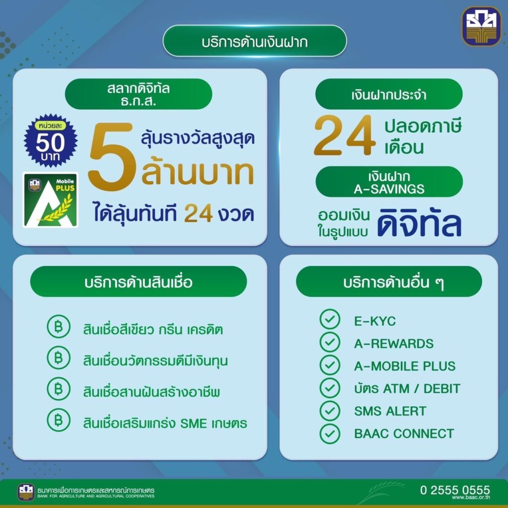 “แคมเปญฝากแสน แถมพัน” เมื่อสมัครใช้บริการ A-Mobile Plus และฝากเงิน A-Savings 100,000 บาทขึ้นไป รับคะแนน A-Rewards 1,000 คะแนน หรือออมเบา ๆ กับสลากดิจิทัล ธ.ก.ส. ราคาหน่วยละ 50 บาท อายุสลาก 2 ปี เมื่อครบกำหนดจะได้รับดอกเบี้ยหน่วยละ 0.07 บาท และระหว่างถือสลาก สามารถลุ้นรางวัลที่ 1 มูลค่า 5,000,000 บาท และรางวัลอื่น ๆ อีกมากมาย รวมเงินรางวัล 15,917,000 บาทต่อเดือน ฝากง่าย ๆ ผ่านแอปพลิเคชัน A-Mobile Plus ที่สำคัญดอกเบี้ยและเงินรางวัลได้รับการยกเว้นภาษี