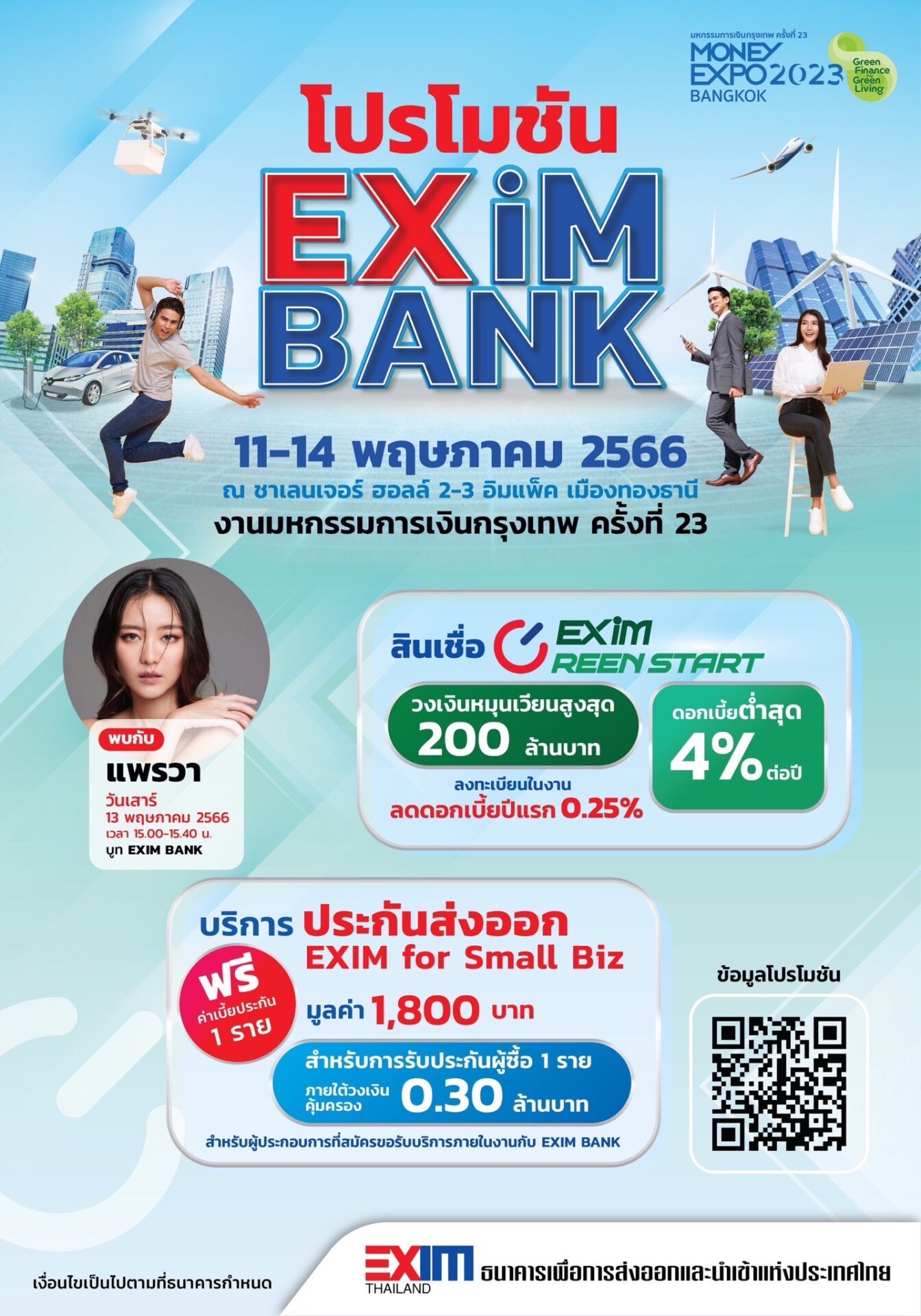 ธนาคารเพื่อการส่งออกและนำเข้าแห่งประเทศไทย (EXIM BANK) ขอเชิญผู้ประกอบการและผู้สนใจเยี่ยมชมบูท EXIM BANK (บูท H7) รูปแบบ “สวนหลังบ้านเพื่อความยั่งยืน (Sustainability Urban Courtyard)” ในงาน “มหกรรมการเงินกรุงเทพ ครั้งที่ 23 (Money Expo 2023)” ระหว่างวันที่ 11-14 พฤษภาคม 2566 ณ อาคารชาเลนเจอร์ ฮอลล์ 2-3 อิมแพ็ค เมืองทองธานี พบกับ “คลินิก EXIM เพื่อคนตัวเล็ก” เพื่อรับคำปรึกษาทางการเงิน แก้หนี้ และเติมทุนให้แก่ผู้ประกอบการ SMEs และบุคคลทำธุรกิจที่สนใจจะเริ่มต้นหรือขยายธุรกิจส่งออก ด้วยแพ็กเกจจัดเต็มพร้อมโปรโมชันพิเศษ โดยเฉพาะธุรกิจเป็นมิตรกับสิ่งแวดล้อม