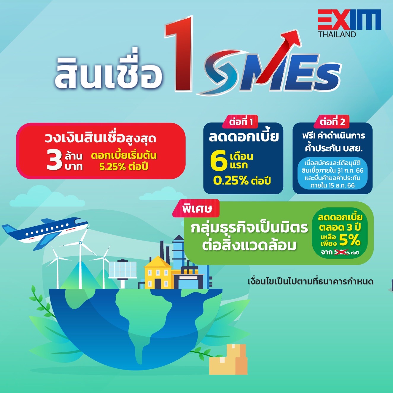 • สินเชื่อ 1 SMEs วงเงินสูงสุด 3 ล้านบาท ดอกเบี้ยเริ่มต้นร้อยละ 5.25 ต่อปี พร้อมสิทธิพิเศษ ต่อที่ 1 ลดดอกเบี้ย 6 เดือนแรก ร้อยละ 0.25 ต่อปี ต่อที่ 2 ฟรี! ค่าดำเนินการค้ำประกัน บสย. เมื่อสมัครและได้อนุมัติสินเชื่อภายใน 31 กรกฎาคม 66 และยื่นคำขอค้ำประกันภายใน 15 สิงหาคม 2566 พิเศษ! ธุรกิจเป็นมิตรต่อสิ่งแวดล้อม ลดดอกเบี้ยตลอด 3 ปี เหลือเพียงร้อยละ 5 ต่อปี
