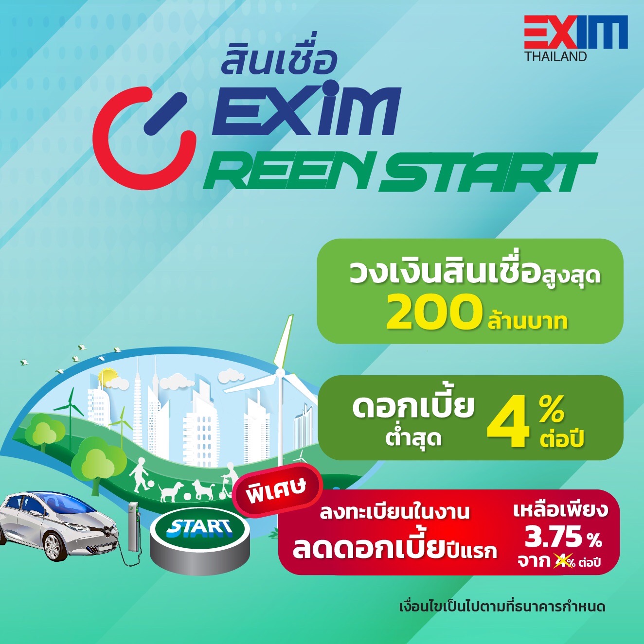 • สินเชื่อ EXIM Green Start วงเงินสูงสุด 200 ล้านบาท ดอกเบี้ยต่ำสุดร้อยละ 4 ต่อปี พิเศษ! ลงทะเบียนในงาน ลดดอกเบี้ยปีแรก เหลือเพียงร้อยละ 3.75 ต่อปี