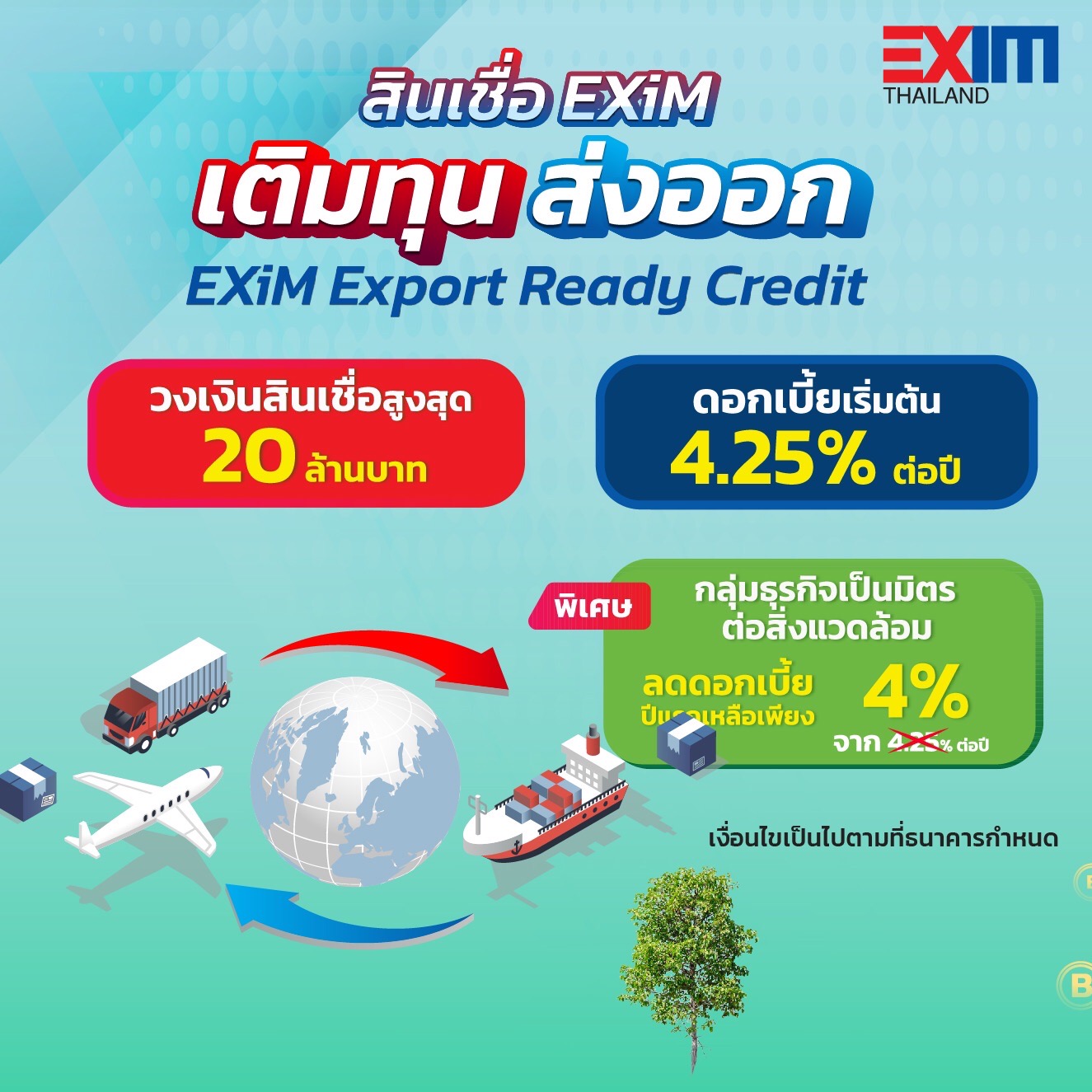 • สินเชื่อเอ็กซิมเติมทุนส่งออก (EXIM Export Ready Credit) วงเงินสูงสุด 20 ล้านบาท ดอกเบี้ยเริ่มต้น 4.25% ต่อปี พิเศษ! ธุรกิจเป็นมิตรต่อสิ่งแวดล้อม ลดดอกเบี้ยปีแรก เหลือเพียงร้อยละ 4 ต่อปี