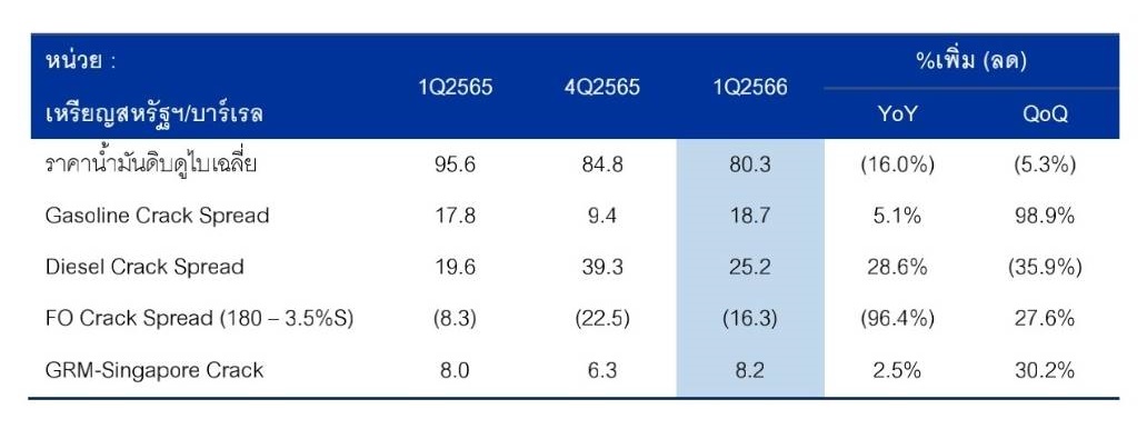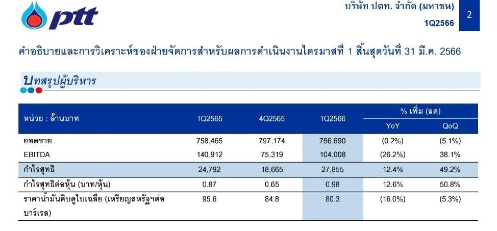 นายอรรถพล ฤกษ์พิบูลย์ ประธานเจ้าหน้าที่บริหารและกรรมการผู้จัดการใหญ่ บริษัท ปตท. จำกัด (มหาชน) เปิดเผยว่า จากปัญหาความขัดแย้งและความตึงเครียดทางภูมิรัฐศาสตร์ในหลายประเทศ การปรับลดกำลังการผลิตน้ำมันดิบในกลุ่มประเทศ OPEC และชาติพันธมิตร จนถึงสิ้นปี 2566 และเศรษฐกิจทั่วโลกชะลอตัว ส่งผลให้ไตรมาส 1 ปี 2566 ปตท. และบริษัทย่อย มีกำไรจากการดำเนินงานก่อนค่าเสื่อมราคาและค่าตัดจำหน่าย ต้นทุนทางการเงิน และภาษีเงินได้ (EBITDA) ที่ 104,008 ล้านบาท ลดลง 36,904 ล้านบาท หรือร้อยละ 26.2 จากไตรมาส 1 ปี 2565 ที่จำนวน 140,912 ล้านบาท โดยหลักจากกลุ่มธุรกิจปิโตรเคมีและการกลั่น ซึ่งมีผลทำให้ทั้งกลุ่มขาดทุนจากสตอกน้ำมันเพิ่มขึ้น เพิ่มขึ้นเมื่อเทียบไตรมาส 1/65 ประมาณ 34,000 ล้านบาท แม้ว่า Market GRM เพิ่มขึ้นจาก 6.1 เหรียญสหรัฐต่อบาร์เรล ในไตรมาส 1/65 เป็น 8.4 เหรียญสหรัฐต่อบาร์เรล ในไตรมาส 1/66 จากส่วนต่างราคาน้ำมันดีเซล น้ำมันอากาศยาน และน้ำมันเบนซิน กับน้ำมันดิบปรับเพิ่มขึ้น รามทั้งปริมาณขายเพิ่มขึ้น ในส่วนของผลการดำเนินงานของธุรกิจปิโตรเคมีปรับตัวลดลงจากปริมาณขายที่ลดลง ประกอบกับส่วนต่างราคาผลิตภัณฑ์กับวัตถุดิบส่วนใหญ่ปรับลดลง นอกจากนี้ ผลการดำเนินงานของกลุ่มธุรกิจก๊าซธรรมชาติลดลงจากธุรกิจโรงแยกก๊าซฯ ที่มีราคาขายเฉลี่ยที่ลดลงเกือบทุกผลิตภัณฑ์ ตามราคาปิโตรเคมีในตลาดที่ใช้อ้างอิง ประกอบกับปริมาณขายลดลง รวมถึงต้นทุนค่าเนื้อก๊าซฯ สูงขึ้นตามราคาก๊าซฯ ในอ่าวที่ปรับเพิ่มขึ้น ในส่วนของธุรกิจระบบท่อส่งก๊ซฯ มีผลการดำเนินงานลดลง จากการปรับอัตราค่าผ่านท่อตามมติคณะกรรมการกำกับกิจการพลังงาน (กกพ.) ซึ่งมีผลบังคับใช้ตั้งแต่เดือนสิงหาคม 2565 เป็นต้นมา