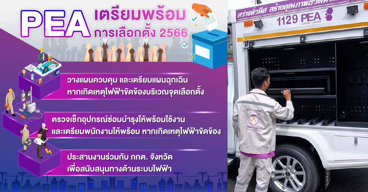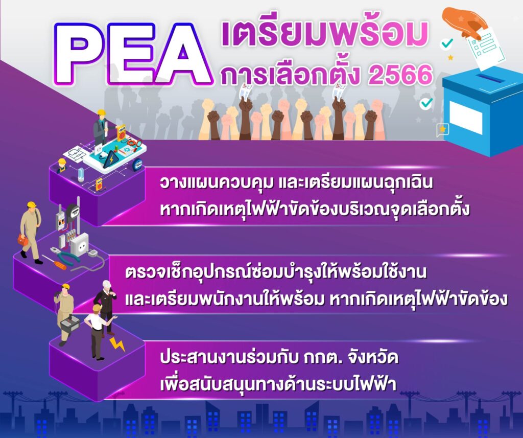 ตามที่ได้มีประกาศคณะกรรมการการเลือกตั้ง (กกต.) กำหนดให้ลงคะแนนเสียงเลือกตั้งสมาชิกสภาผู้แทนราษฎร (ส.ส.) ในวันอาทิตย์ที่ 14 พฤษภาคม 2566 เวลา 08.00 – 17.00 น. การไฟฟ้าส่วนภูมิภาค (PEA) พร้อมสนับสนุนการเลือกตั้ง ด้วยการติดตาม ดูแล เฝ้าระวัง ป้องกันและเตรียมความพร้อมด้านการจ่ายไฟฟ้าเพื่อความมั่นคงของระบบไฟฟ้าในช่วงเลือกตั้งโดยดำเนินการ ดังนี้