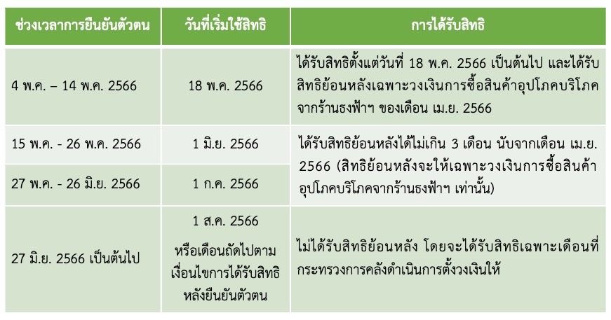 ในการยืนยันตัวตน ผู้ผ่านเกณฑ์จะต้องใช้บัตรประจำตัวประชาชนอเนกประสงค์ (Smart Card) และต้องผูกบัญชีพร้อมเพย์กับเลขประจำตัวประชาชนกับธนาคารใดก็ได้ เนื่องจากการผูกบัญชีพร้อมเพย์ไว้ล่วงหน้าจะทำให้ผู้ได้รับสิทธิโครงการฯ สะดวกในการรับสิทธิสวัสดิการหากภาครัฐมีการให้สวัสดิการเป็นเงินโอนเข้าบัญชีในอนาคต สำหรับผู้ผ่านเกณฑ์คุณสมบัติรอบใหม่ที่ไม่ได้ยืนยันตัวตนภายในวันอาทิตย์ที่ 14 พฤษภาคม 2566 ยังคงยืนยันตัวตนได้ที่ธนาคารทั้งสามแห่งข้างต้นตามวันเวลาที่หน่วยงานกำหนด แต่จะเริ่มใช้สิทธิสวัสดิการแห่งรัฐได้ตามวันที่กระทรวงการคลังกำหนด โดยรายละเอียดช่วงเวลาการยืนยันตัวตนและวันที่เริ่มใช้สิทธิ รายละเอียดปรากฏตามตาราง