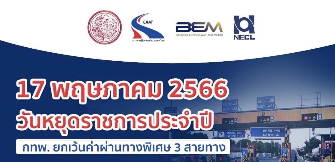 กรุงเทพฯ 15 พ.ค.-การทางพิเศษแห่งประเทศไทย (กทพ.) ยกเว้นค่าผ่านทางพิเศษ 3 สายทาง 17 พ.ค.นี้ (วันพืชมงคล) ตั้งแต่เวลา 00.01 น. ถึง 24.00 น.