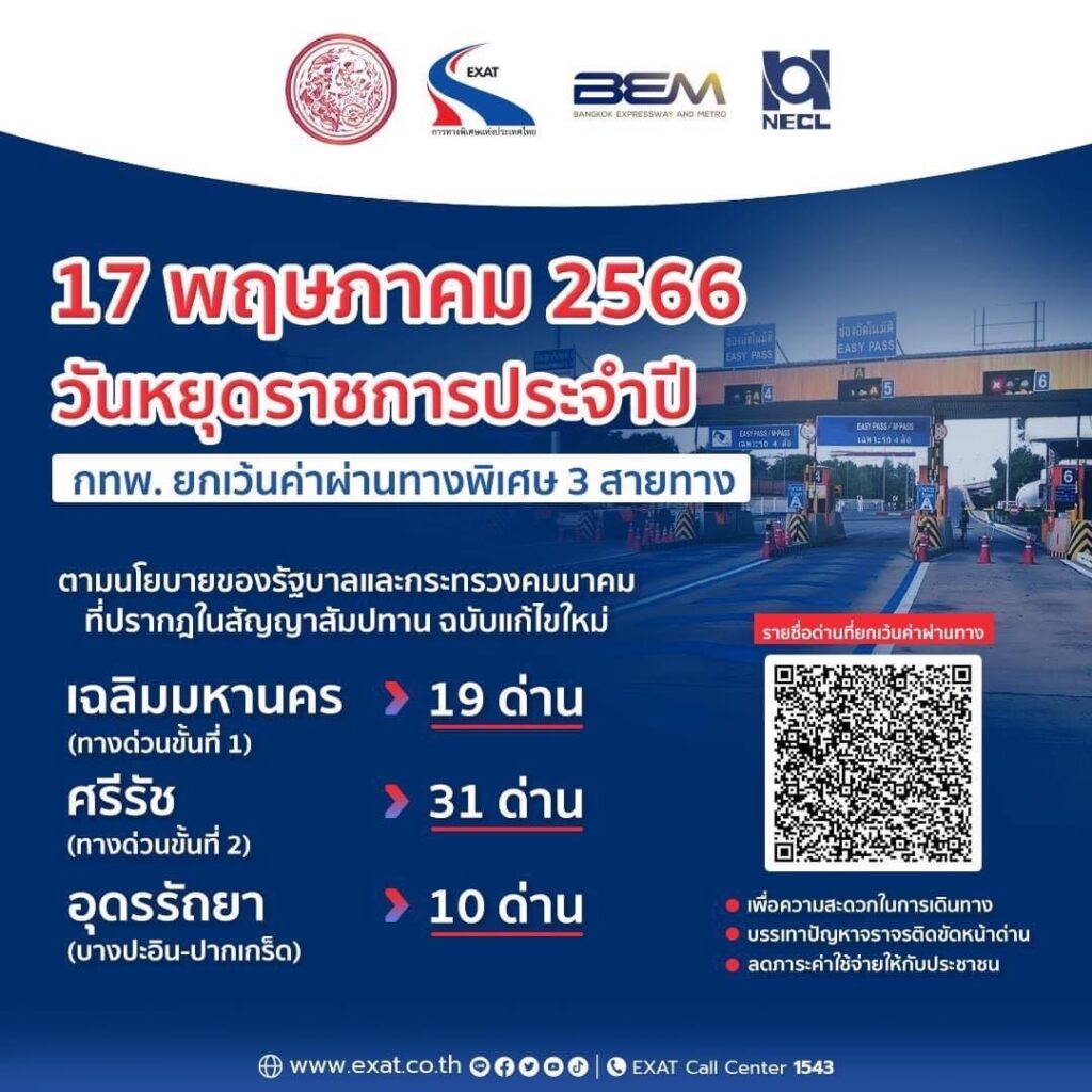 ตามนโยบายของรัฐบาลและกระทรวงคมนาคมที่ปรากฏในสัญญาสัมปทานฉบับแก้ไขใหม่ระหว่าง กทพ. บริษัททางด่วนและรถไฟฟ้ากรุงเทพ จำกัด (มหาชน) (BEM) และบริษัททางด่วนกรุงเทพเหนือ จำกัด (NECL) เพื่อเป็นการอำนวยความสะดวกในการเดินทางของประชาชนในวันหยุดและช่วยลดภาระค่าใช้จ่ายให้แก่ประชาชน รวมทั้งช่วยลดปัญหาจราจรติดขัดบริเวณหน้าด่านเก็บค่าผ่านทางพิเศษ โดยยกเว้น การเก็บค่าผ่านทางพิเศษเฉลิมมหานคร(ทางด่วนขั้นที่ 1) จำนวน 19 ด่าน ทางพิเศษศรีรัช (ทางด่วนขั้นที่ 2) จำนวน 31 ด่าน และทางพิเศษอุดรรัถยา(บางปะอิน-ปากเกร็ด) จำนวน 10 ด่าน