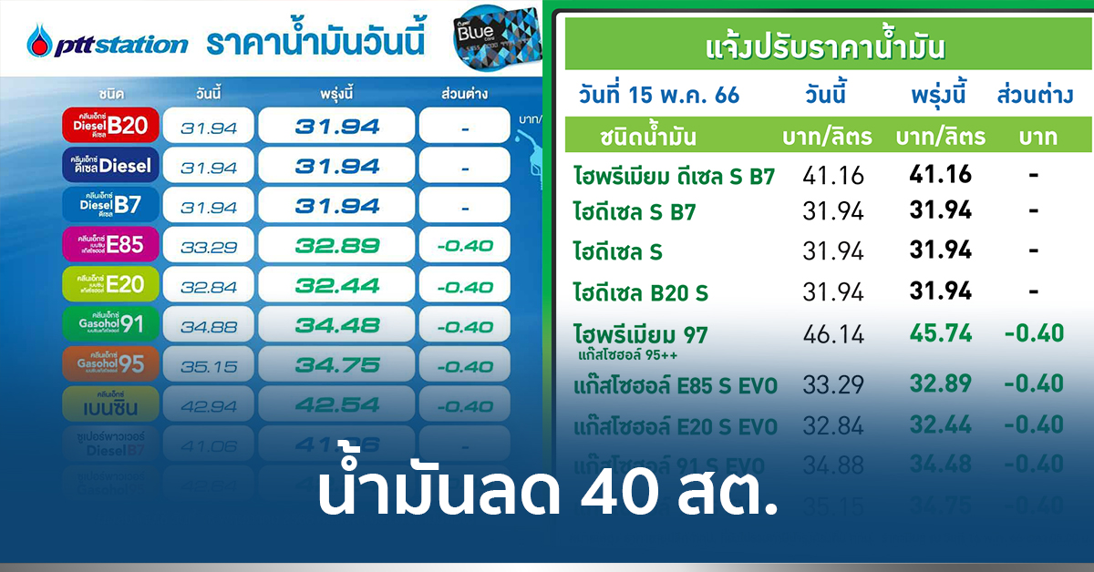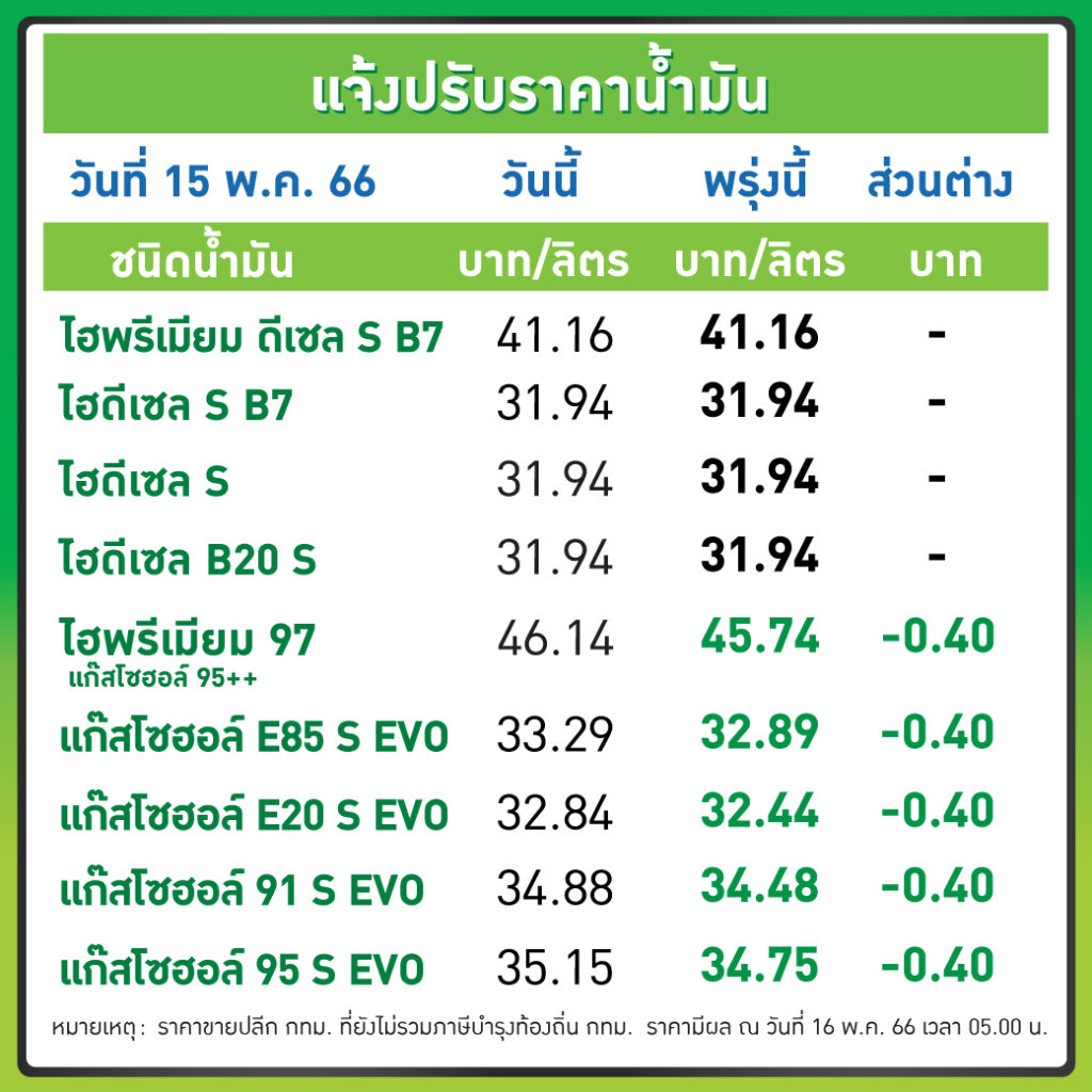 PTT Station ปรับราคาขายปลีกน้ำมันกลุ่มเบนซินและแก๊สโซฮอล์ทุกชนิดลง 0.40 บาท/ลิตร ส่วนกลุ่มดีเซลคงเดิม มีผล 16 พ.ค. 2566 เวลา 05.00 น. เป็นต้นไป โดยราคาขายปลีกจะเป็นดังนี้ ULG = 42.54, GSH95 = 34.75, E20 = 32.44, GSH91 = 34.48, E85 = 32.89, พรีเมี่ยม GSH95 = 42.24, HSD-B7 = 31.94, HSD-B10 = 31.94, HSD-B20 = 31.94, พรีเมี่ยมดีเซล B7 = 41.06 บาทต่อลิตร โดยราคาขายปลีกข้างต้นยังไม่รวมภาษีบำรุงกรุงเทพมหานคร