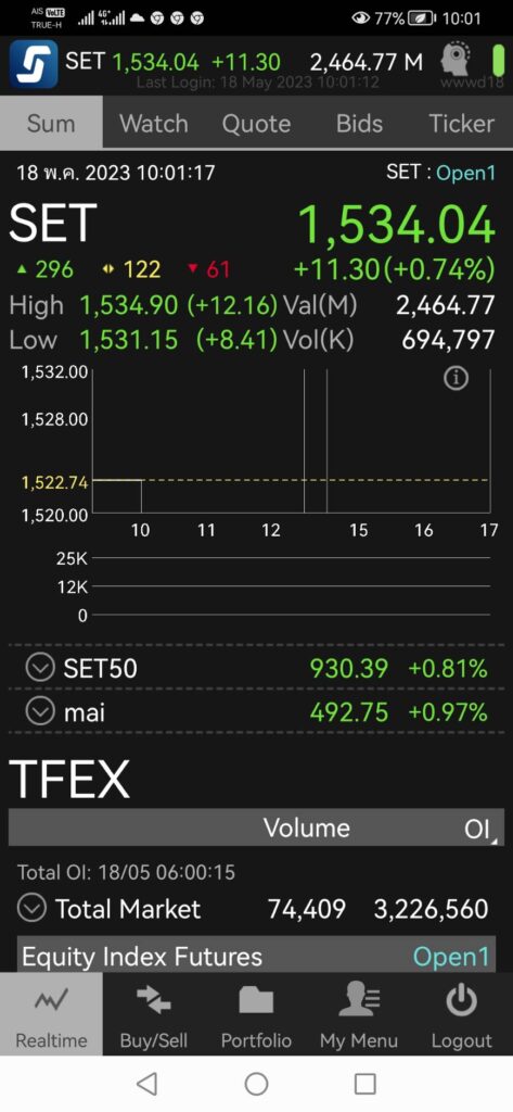 เมื่อเวลา 10.01 น. ดัชนี SET มาอยู่ที่ 1,534.04 จุด เพิ่มขึ้น 11.30 จุด (+0.74%) มีแรงซื้อกลับหุ้นขนาดใหญ่ (Big Cap) กลุ่มแบงก์ กลุ่มพลังงาน