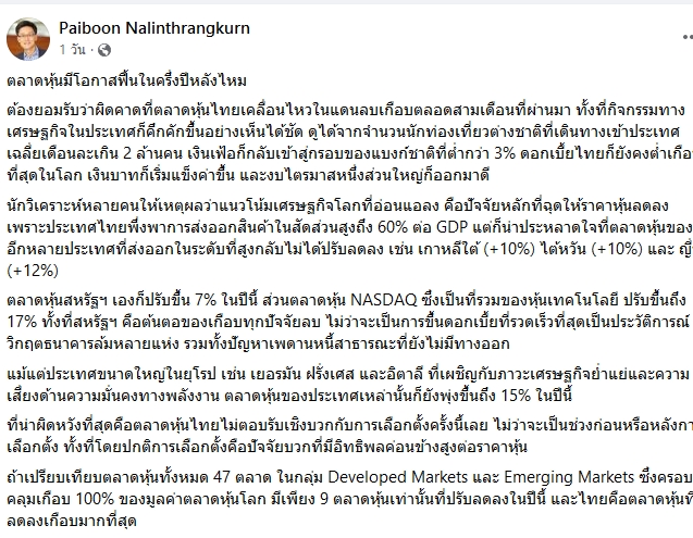นายไพบูลย์ ระบุด้วยว่า ต้องยอมรับว่าผิดคาดที่ตลาดหุ้นไทยเคลื่อนไหวในแดนลบเกือบตลอด 3 เดือนที่ผ่านมา ทั้งที่กิจกรรมทางเศรษฐกิจในประเทศก็คึกคักขึ้นอย่างเห็นได้ชัด ดูได้จากจำนวนนักท่องเที่ยวต่างชาติที่เดินทางเข้าประเทศเฉลี่ยเดือนละเกิน 2 ล้านคน เงินเฟ้อก็กลับเข้าสู่กรอบของแบงก์ชาติที่ต่ำกว่า 3% ดอกเบี้ยไทยก็ยังคงต่ำเกือบที่สุดในโลก เงินบาทก็เริ่มแข็งค่าขึ้น และงบไตรมาส 1 ส่วนใหญ่ก็ออกมาดี