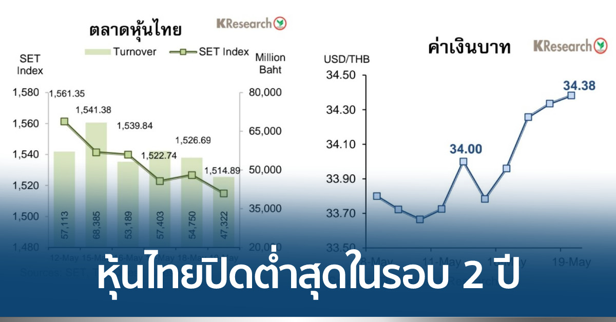 บริษัทศูนย์วิจัยกสิกรไทย จำกัด รายงานว่าหุ้นไทยปิดต่ำสุดในรอบกว่า 2 ปี 2 เดือน ท่ามกลางแรงฉุดจากปัจจัยทั้งในและต่างประเทศ โดยหุ้นไทยปรับตัวลงตั้งแต่ต้นสัปดาห์ หลังนักลงทุนกังวลเกี่ยวกับนโยบายของพรรคการเมืองที่ชนะการเลือกตั้ง โดยเฉพาะเรื่องการลดค่าไฟฟ้าและลดปัญหาการผูกขาด ซึ่งกระตุ้นแรงขายหุ้นบิ๊กแคป โดยเฉพาะกลุ่มโรงไฟฟ้าและสื่อสาร นอกจากนี้ หุ้นไทยยังมีแรงกดดันเพิ่มเติมจากความกังวลต่อทิศทางดอกเบี้ยสหรัฐ หลังถ้อยแถลงของเจ้าหน้าที่เฟดหลายรายยังไม่ส่งสัญญาณถึงโอกาสของการปรับลดดอกเบี้ย