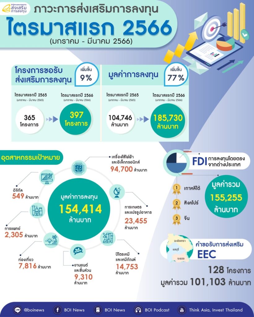 นายนฤตม์ เทอดสถีรศักดิ์ เลขาธิการคณะกรรมการส่งเสริมการลงทุน หรือ บีโอไอ เปิดเผยว่า สถิติคำขอรับการส่งเสริมการลงทุนไตรมาสแรก (มกราคม – มีนาคม) ปี 2566 มีโครงการยื่นขอรับส่งเสริมการลงทุนรวมทั้งสิ้น 397 โครงการ เพิ่มขึ้นร้อยละ 9 และมีมูลค่าเงินลงทุน 185,730 ล้านบาท เพิ่มขึ้นร้อยละ 77 เมื่อเทียบกับช่วงเดียวกันของปีก่อน สำหรับคำขอส่งเสริมการลงทุนในอุตสาหกรรมเป้าหมายมี 205 โครงการ มูลค่ารวม 154,414 ล้านบาท คิดเป็นร้อยละ 83 ของมูลค่าการขอรับส่งเสริมทั้งสิ้น ส่วนใหญ่เป็นการลงทุนในอุตสาหกรรมเครื่องใช้ไฟฟ้าและอิเล็กทรอนิกส์ อาหารแปรรูป เคมีภัณฑ์ ยานยนต์และชิ้นส่วน ตามลำดับ ขณะที่การส่งเสริมให้ผู้ประกอบการปรับปรุงประสิทธิภาพในด้านต่าง ๆ ตามมาตรการยกระดับอุตสาหกรรม (Smart and Sustainable Industry) มีจำนวน 77 โครงการ มูลค่ารวม 4,434 ล้านบาท โดยส่วนใหญ่เป็นประเภทการประหยัดพลังงานและใช้พลังงานหมุนเวียน 60 โครงการ มูลค่าเงินลงทุน 3,333 ล้านบาท