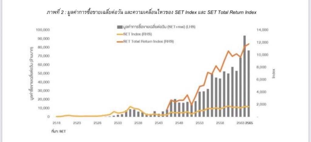 SET Note ฉบับที่ 6-2566 เผยแพร่รายงานของ นายฉัตรชัย ทิศาดลดิลก และนายพริษฐ์ เงาเบญจกุล ฝ่ายวิจัยตลาดหลักทรัพย์แห่งประเทศไทย (ตลท. ) หัวข้อ “48 ปี ตลาดหลักทรัพย์แห่งประเทศไทย” โดยระบุว่าตลาดทุนนับเป็นกลไกสำคัญในระบบเศรษฐกิจ ในการรวบรวมและจัดสรรการใช้ทรัพยากรทางเศรษฐกิจให้เป็นไปอย่างมีประสิทธิภาพ เพื่อส่งเสริมการเติบโตของเศรษฐกิจ เปิดโอกาสให้กิจการต่างๆ สามารถเข้าถึงแหล่งเงินทุน ช่วยให้ผู้ลงทุนมีทางเลือกในการออมการลงทุน และการสะสมความมั่งคั่ง ในช่วงเกือบห้าทศวรรษที่ผ่านมา ตลาดทุนและตลาดหลักทรัพย์ฯ ได้มีบทบาทในระบบเศรษฐกิจมากขึ้นเรื่อยๆ หลังวิกฤตเศรษฐกิจในปี 2540 เป็นต้นมา โดยมีสัดส่วนมูลค่าหลักทรัพย์ตามราคาตลาด (Market Capitalization) ต่อ GDP เติบโตต่อเนื่อง และสูงถึง 121% ในปี2565 สะท้อนภาพรวมของพัฒนาการและความสำคัญของตลาดหลักทรัพย์ต่อระบบเศรษฐกิจที่มีมากขึ้น และได้เติบโตขึ้นในหลายๆ มิติ อาทิเช่น ขนาดของตลาดโดยรวม สภาพคล่องการซื้อขาย ปริมาณการระดมทุน การขยายฐานนักลงทุนที่หลากหลาย รวมทั้งความโดดเด่นและได้รับการยอมรับในเรื่องความยั่งยืน เป็นต้น