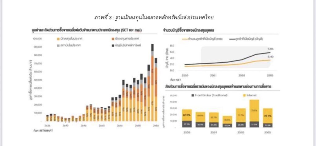 จำนวนบัญชีซื้อขายหลักทรัพย์ ณ สิ้นปี 2565 มีจำนวนทั้งสิ้น 5,848,429 บัญชี เพิ่มขึ้น 12.01% จากสิ้นปี 2564 และมูลค่าการซื้อขายทางอินเทอร์เน็ตของผู้ลงทุนบุคคลเฉลี่ยทั้งปี 2565 อยู่ที่ 78.08% ของมูลค่าการซื้อขายรวมของผู้ลงทุนบุคคล สะท้อนภาพการพัฒนากระบวนการ Digitalization ในตลาดทุน และช่วยส่งเสริมสภาพคล่องในการซื้อขายของตลาดหลักทรัพย์ฯ