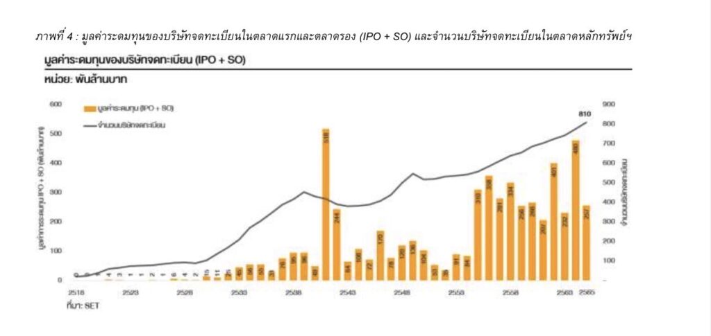 ในด้านการระดมทุน มีมูลค่าการระดมทุนของบริษัทจดทะเบียนทั้งในตลาดแรกและตลาดรอง (IPO + SO) ปรับตัวสูงขึ้นมากในช่วง 5 ปีที่ผ่านมา โดยมีมูลค่าการระดมทุนรวมสูงถึง 1.58 ล้านล้านบาท โดยในปี 2565 ตลาดหลักทรัพย์ไทยมีมููลค่าการเสนอขายหลักทรัพย์ IPO ที่ 127,836 ล้านบาท สูงที่สุดในอาเซียน และเป็นอันดับที่ 4 ของเอเชียโดยมีบริษัทที่อยู่ในกลุ่มอุตสาหกรรมหรือธุรกิจใหม่ๆ (New Economy) ซึ่งได้ช่วยเสริมสร้างความหลากหลายให้กับตลาดทุน ส่งผลให้ตลาดหลักทรัพย์ฯ มีจำนวนบริษัทจดทะเบียนเพิ่มขึ้นเป็น 810 บริษัท นอกจากนี้ ยังได้เปิดให้บริการตลาดหลักทรัพย์ไลฟ์เอ็กซ์เช้นจ์ (LiVEx) เพื่อสนับสนุนการเข้าถึงแหล่งทุนของผู้ประกอบการ SMEs และStartups ซึ่งในปี 2565 ได้มีการระดมทุนและเข้าจดทะเบียนไปแล้ว 3 บริษัท มูลค่าระดมทุนรวม 196 ล้านบาท