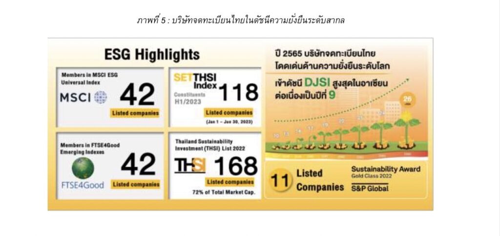 บริษัทจดทะเบียนไทยได้รับการคัดเลือกเข้าไปในดัชนีด้านความยั่งยืนระดับสากลเพิ่มขึ้นในช่วงหลายปีที่ผ่านมา และได้รับคัดเลือกจำนวนสูงที่สุดในอาเซียนหลายปีซ้อน ปีที่ผ่านมาเริ่มเปิดตัวบริการ ESG Data Platform ของบริษัทจดทะเบียน เพื่อส่งเสริมระบบนิเวศน์การลงทุนที่คำนึงถึงความยั่งยืน และปัจจัยด้าน ESG คือ สิ่งแวดล้อม(Environmental) สังคม (Social) และบรรษัทภิบาล (Governance) ผ่านระบบจัดการข้อมูลด้านความยั่งยืน ให้ทุกภาคส่วนในตลาดทุนมีข้อมูลมาตรฐานนำไปต่อยอดพัฒนาผลิตภัณฑ์การลงทุนที่หลากหลายต่อไป