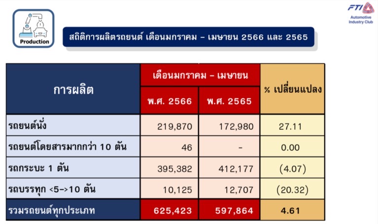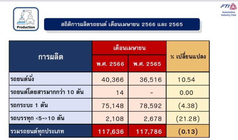 นายสุรพงษ์ ไพสิฐพัฒนพงษ์ รองประธานและโฆษกกลุ่มอุตสาหกรรมยานยนต์ สภาอุตสาหกรรมแห่งประเทศไทย หรือ ส.อ.ท. เปิดเผยว่า ยอดการผลิตรถยนต์ในเดือน เมษายน 2566 มีทั้งสิ้น 117,636 คัน ลดลงจาก ช่วงเดียวกันของปีก่อน ร้อยละ 0.13 เนื่องจากมีวันหยุดยาว แต่ในช่วง 4 เดือนแรกของปี มียอดผลิตรวมจำนวนทั้งสิ้น 625,423 คัน เพิ่มขึ้น ร้อยละ 4.61 แต่ทั้งนี้ต้องจับตาว่าการผลิตจะทำได้ตามเป้าที่ตั้งไว้ 1,950,000 คันหรือไม่ เนื่องจากการจัดตั้งรัฐบาลที่ยังไม่แล้วเสร็จอาจมีผลต่อการขับเคลื่อนเศรษฐกิจและการผลิตภายในประเทศ เนื่องจากสถาบันการเงินจะปล่อยสินเชื่อยากขึ้น จึงมีผลต่อยอดการผลิตและยอดขายในประเทศ โดยยอดขายรถยนต์ภายในประเทศช่วงเดือนเมษายน 2566 มีจำนวนทั้งสิ้น 59,530 คัน ลดลงจากช่วงเดียวกันของปีก่อน ร้อยละ 6.14 จากการเข้มงวดในการอนุมัติสินเชื่อของสถาบันการเงิน เนื่องจากหนี้ครัวเรือนอยู่ในอัตราสูงและอัตราดอกเบี้ยอยู่ในช่วงขาขึ้น และในช่วง 4 เดือนแรกของปี มียอดขาย 276,603 คัน ลดลงร้อยละ 6.11 และสำหรับการส่งออกรถยนต์สำเร็จรูปในเดือนเมษายน 2566 ส่งออกได้ 79,940 คัน เพิ่มขึ้นร้อยละ 43.53 เพราะผลิตรถยนต์นั่งและรถกระบะเพื่อส่งออกได้เพิ่มขึ้นในตลาดเอเชีย ออสเตรเลีย ตะวันออกออกกลาง แอฟริกา และยุโรป โดยมีมูลค่าการส่งออกกว่า 65,482.77 ล้านบาท เพิ่มขึ้นร้อยละ 17.40 และในช่วง 4 เดือนแรกของปี ส่งออกรถยนต์สำเร็จรูป มีจำนวน 353,632 คัน เพิ่มขึ้นร้อยละ 18.38 คิดเป็นมูลค่ากว่า 218,286.06 ล้านบาท เพิ่มขึ้นร้อยละ 22.88