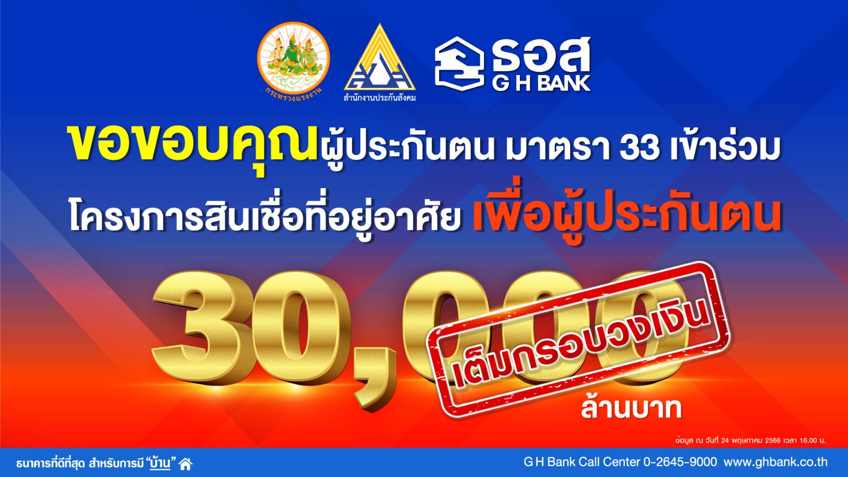 เมื่อวานนี้ (วันที่ 23 พฤษภาคม 2566) มีผู้ประกันตน ยื่นขอสินเชื่อเต็มวงเงิน 30,000 ล้านบาทแล้ว ธอส. จึงขอปิดรับเรื่องการยื่นขอสินเชื่อดังกล่าว สำหรับลูกค้าที่ได้รับอนุมัติสินเชื่อไปแล้ว ยังสามารถมาดำเนินการทำนิติกรรมสัญญาได้ตามขั้นตอนปกติ ทั้งนี้ ธอส. ขอขอบคุณผู้ประกันตนทุกท่านที่ให้ความสนใจเข้าร่วมโครงการดังกล่าว และขออภัยต่อผู้ประกันตนที่เหลือ ไม่สามารถเข้าร่วมโครงการในครั้งนี้ได้