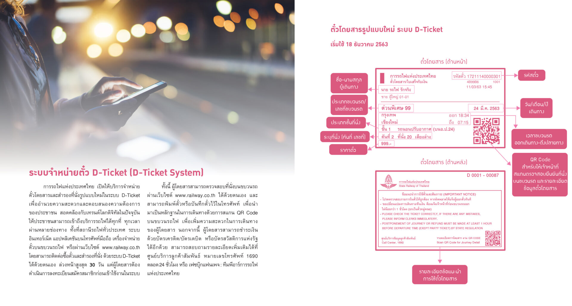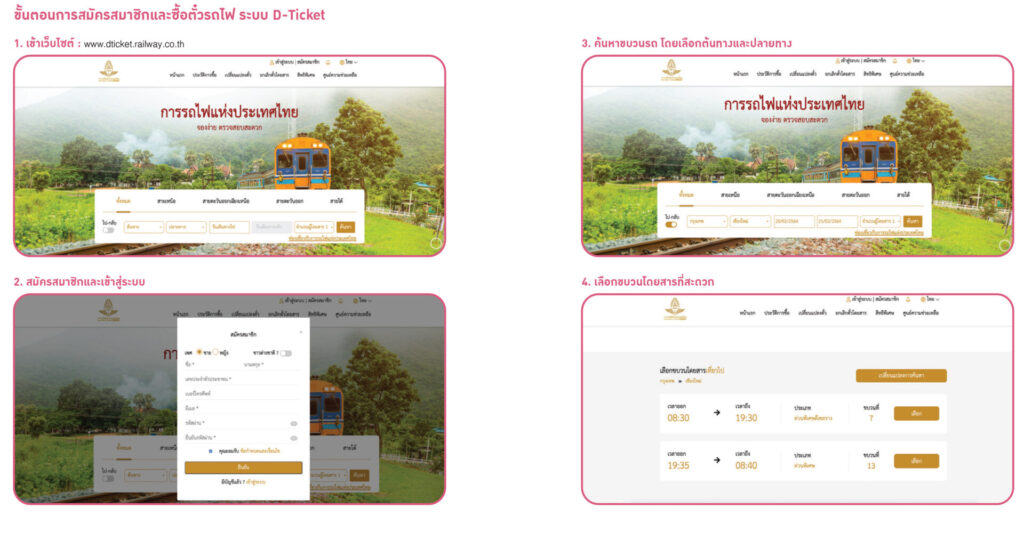 ทีมประชาสัมพันธ์ การรถไฟแห่งประเทศไทย เปิดเผยว่า การรถไฟแห่งประเทศไทย เปิดให้บริการจำหน่ายตั๋วโดยสารและสำรองที่นั่งรูปแบบใหม่ในระบบ D-Ticket เพื่ออำนวยความสะดวกและตอบสนองความต้องการของประชาชน สอดคล้องกับเทรนด์โลกดิจิทัลในปัจจุบันให้กับประชาชนสามารถเข้าถึงบริการรถไฟได้ทุกที่ ทุกเวลา ผ่านหลายช่องทาง ทั้งที่สถานีรถไฟทั่วประเทศ ระบบอินเทอร์เน็ต แอปพลิเคชันบนมือถือ เครื่องจำหน่ายตั๋วบนขบวนรถไฟ หรือผ่านเว็บไซต์ www.railway.co.th