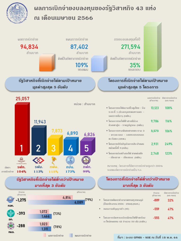 นางปานทิพย์ ศรีพิมล ผู้อำนวยการสำนักงานคณะกรรมการนโยบายรัฐวิสาหกิจ (สคร.) เปิดเผยว่า  ในปี 2566 รัฐวิสาหกิจ ได้เบิกจ่ายงบลงทุนจนถึงเดือนเมษายน 2566 จำนวน 94,834 ล้านบาท หรือคิดเป็น ร้อยละ 109 ของแผนการเบิกจ่าย ประกอบด้วยการเบิกจ่ายงบลงทุนของรัฐวิสาหกิจปีงบประมาณ ( ตุลาคม 2565 – เดือนเมษายน 2566) 34 แห่ง จำนวน 62,997 ล้านบาท หรือคิดเป็นร้อยละ 107 ของแผนการเบิกจ่าย และรัฐวิสาหกิจปีปฏิทิน (เดือนมกราคม 2566 – เดือนเมษายน 2566) 9 แห่ง จำนวน 31,838 ล้านบาท หรือคิดเป็นร้อยละ 113 ของแผนการเบิกจ่าย