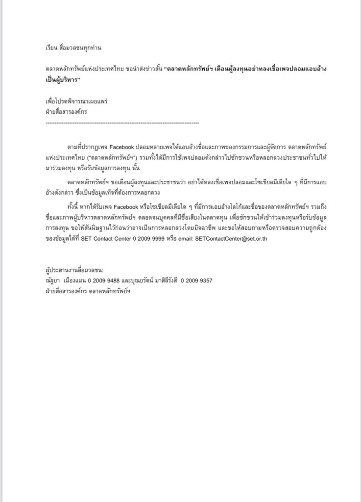 ตามที่ปรากฏเพจ Facebook ปลอมหลายเพจได้แอบอ้างชื่อและภาพของกรรมการและผู้จัดการ ตลาดหลักทรัพย์แห่งประเทศไทย (“ตลาดหลักทรัพย์ฯ”) รวมทั้งได้มีการใช้เพจปลอมดังกล่าวไปชักชวนหรือหลอกลวงประชาชนทั่วไปให้มาร่วมลงทุน หรือรับข้อมูลการลงทุน นั้น ตลาดหลักทรัพย์ฯ ขอเตือนผู้ลงทุนและประชาชนว่า อย่าได้หลงเชื่อเพจปลอมและโซเชียลมีเดียใด ๆ ที่มีการแอบอ้างดังกล่าว ซึ่งเป็นข้อมูลเท็จที่ต้องการหลอกลวง