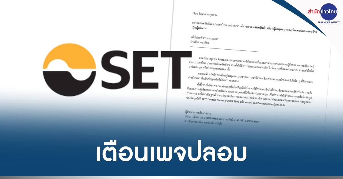 ทั้งนี้ หากได้รับเพจ Facebook หรือโซเชียลมีเดียใด ๆ ที่มีการแอบอ้างโลโก้และชื่อของตลาดหลักทรัพย์ฯ รวมถึงชื่อและภาพผู้บริหารตลาดหลักทรัพย์ฯ ตลอดจนบุคคลที่มีชื่อเสียงในตลาดทุน เพื่อชักชวนให้เข้าร่วมลงทุนหรือรับข้อมูลการลงทุน ขอให้สันนิษฐานไว้ก่อนว่าอาจเป็นการหลอกลวงโดยมิจฉาชีพ และขอให้สอบถามหรือตรวจสอบความถูกต้องของข้อมูลได้ที่ SET Contact Center 0 2009 9999 หรือ email: SETContactCenter@set.or.th .-สำนักข่าวไทย
