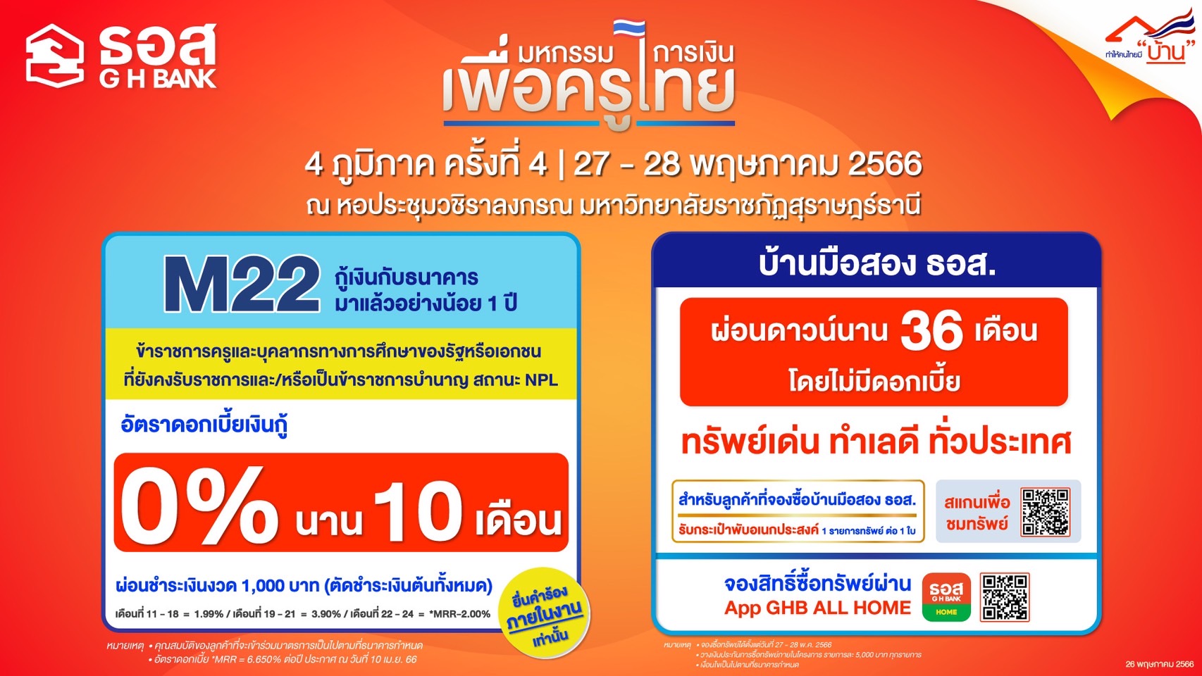 ธนาคารอาคารสงเคราะห์ (ธอส.) นำมาตรการแก้หนี้และผลิตภัณฑ์ ทางการเงินเข้าร่วมงานมหกรรมการเงินเพื่อครูไทย 4 ภูมิภาค ครั้งที่ 4 จ.สุราษฎร์ธานี เพื่อให้ข้าราชการครูและบุคลากรทางการศึกษาใน จ.สุราษฎร์ธานี นครศรีธรรมราช ชุมพรกระบี่ พังงา ระนอง และพัทลุง ได้รับความช่วยเหลืออย่างครบวงจรและมีคุณภาพชีวิตที่ดีขึ้น นำโดยมาตรการช่วยเหลือลูกค้าปัจจุบันของธนาคาร มาตรการ 22 [M22] สำหรับลูกค้าข้าราชการครูและบุคลากรทางการศึกษาของรัฐหรือเอกชน ที่ยังคงรับราชการและ/หรือเป็นข้าราชการบำนาญ ที่มีสถานะเป็น NPL กู้เงินกับธนาคาร มาแล้วอย่างน้อย 1 ปี หรือ มีสถานะเป็น NPLที่อยู่ระหว่าง การใช้มาตรการ/ปรับโครงสร้างหนี้กับธนาคาร