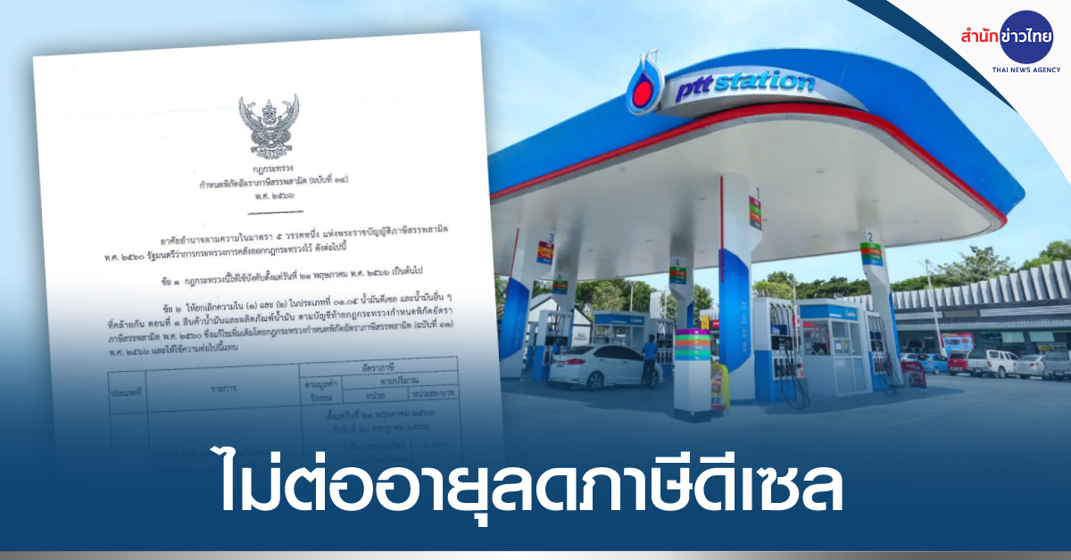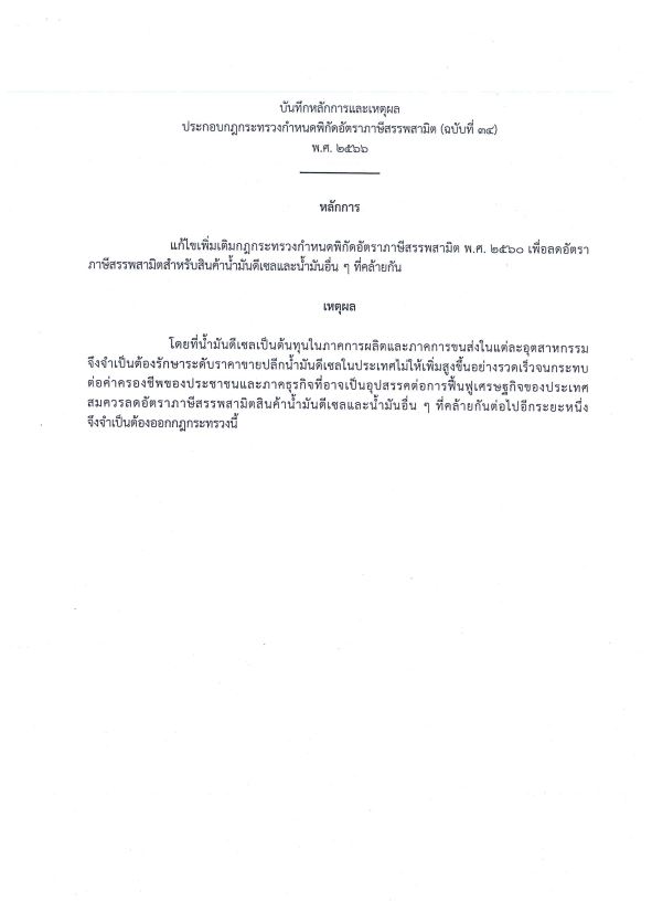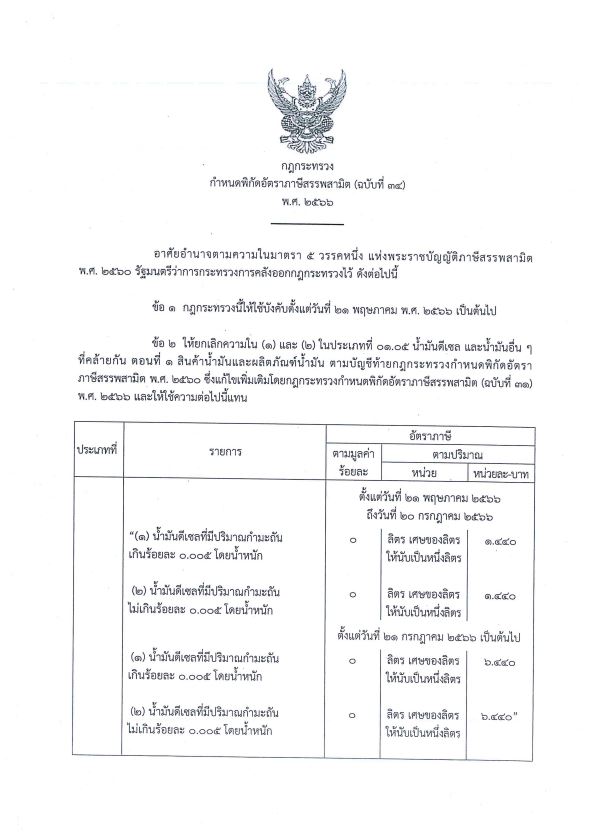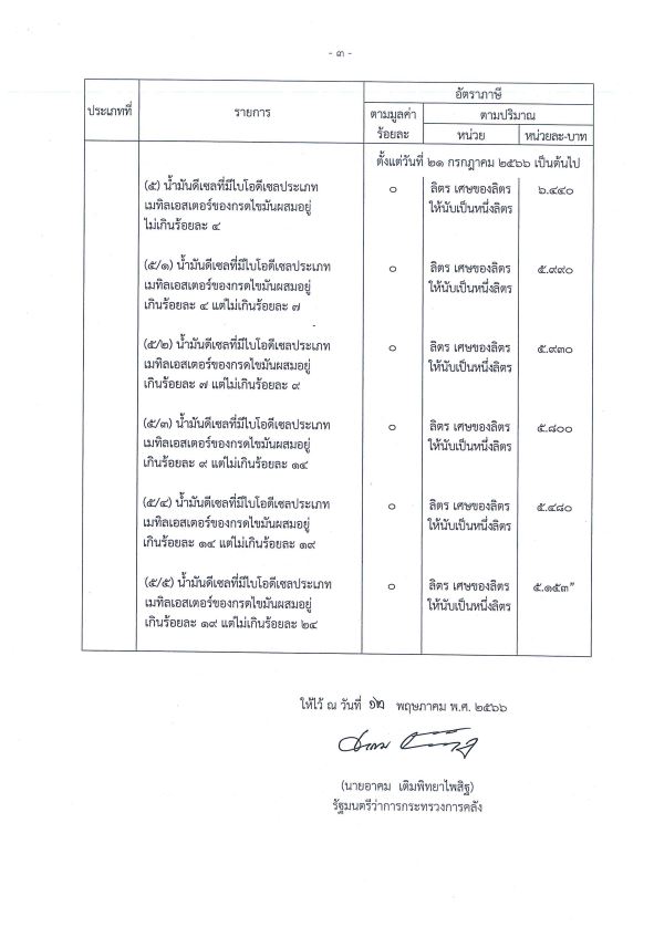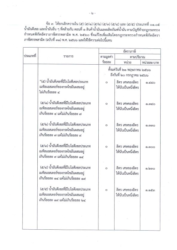 ทั้งนี้ นายอาคม เติมพิทยาไพสิฐ รัฐมนตรีว่าการกระทรวงการคลัง ได้ลงนามประกาศกฎกระทรวงกำหนดพิกัดอัตราภาษีสรรพสามิตดีเซล โดยกำหนดที่จะไม่ต่อมาตรการลดภาษีสรรพสามิตดีเซล 5 บาท/ลิตร ออกไป โดยจะสิ้นสุด 21 ก.ค.66 เนื่องจากให้รอรัฐบาลใหม่มาพิจารณา เพราะว่าด้วยเรื่องของงบประมาณการจัดเก็บภาษีของกรมสรรพสามิตที่หายไปด้วย