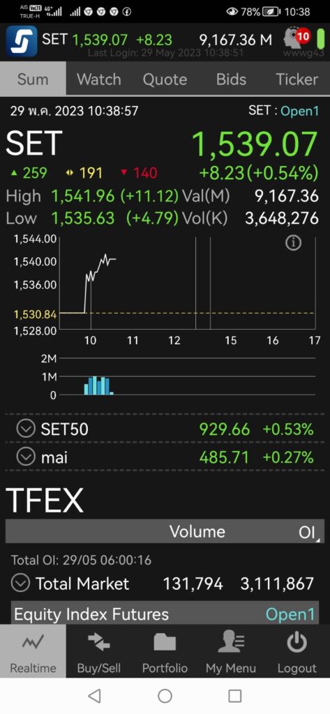 ผู้สื่อข่าว รายงานว่า หุ้นไทย ”วันนี้(29 พ.ค.) เปิดตลาด อยู่ที่ 1,539.44 จุด บวก 8.60จุด หรือ 0.56% และเมื่อเวลา 10.38 น. เคลื่อนไหว บวก 8.23 จุด ตามทิศทางตลาดต่างประเทศที่ได้รับ Sentiment เชิงบวกจากรายงานข่าวระบุว่า ประธานาธิบดีโจ ไบเดน และนายเควิน แมคคาร์ธี ประธานสภาผู้แทนราษฎรสหรัฐ ได้บรรลุข้อตกลงขั้นสุดท้ายในการปรับเพิ่มเพดานหนี้ ซึ่งจะช่วยให้สหรัฐสามารถหลีกเลี่ยงการผิดนัดชำระหนี้ โดยมีแรงซื้อหุ้นขนาดใหญ่ อาทิ KBANK CPALL PTTEP