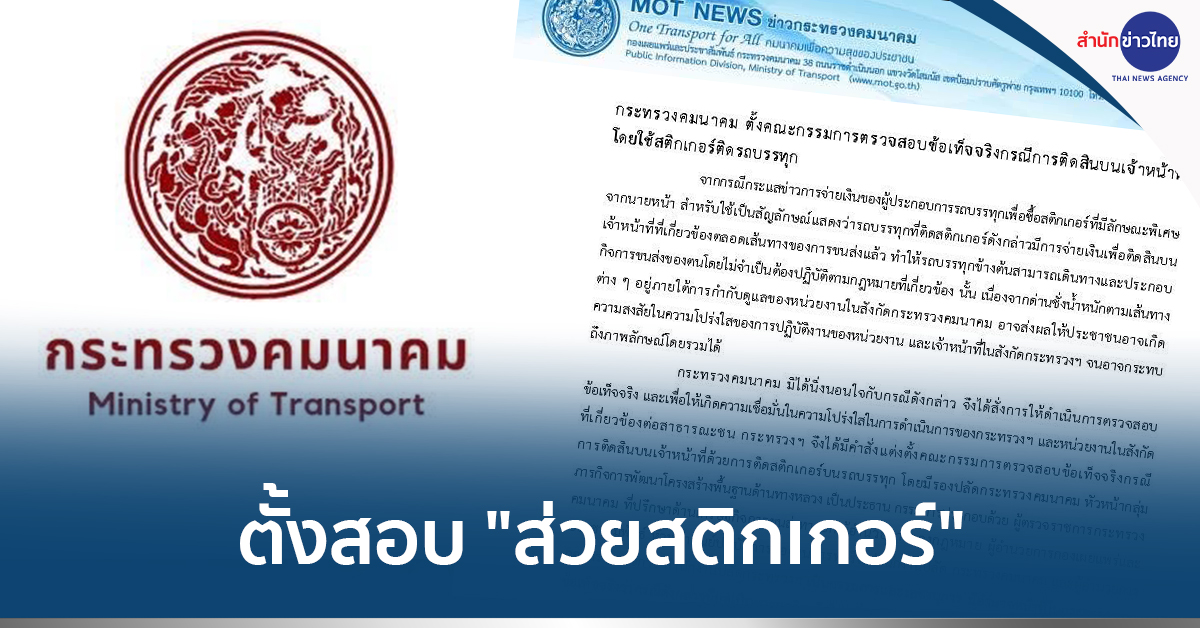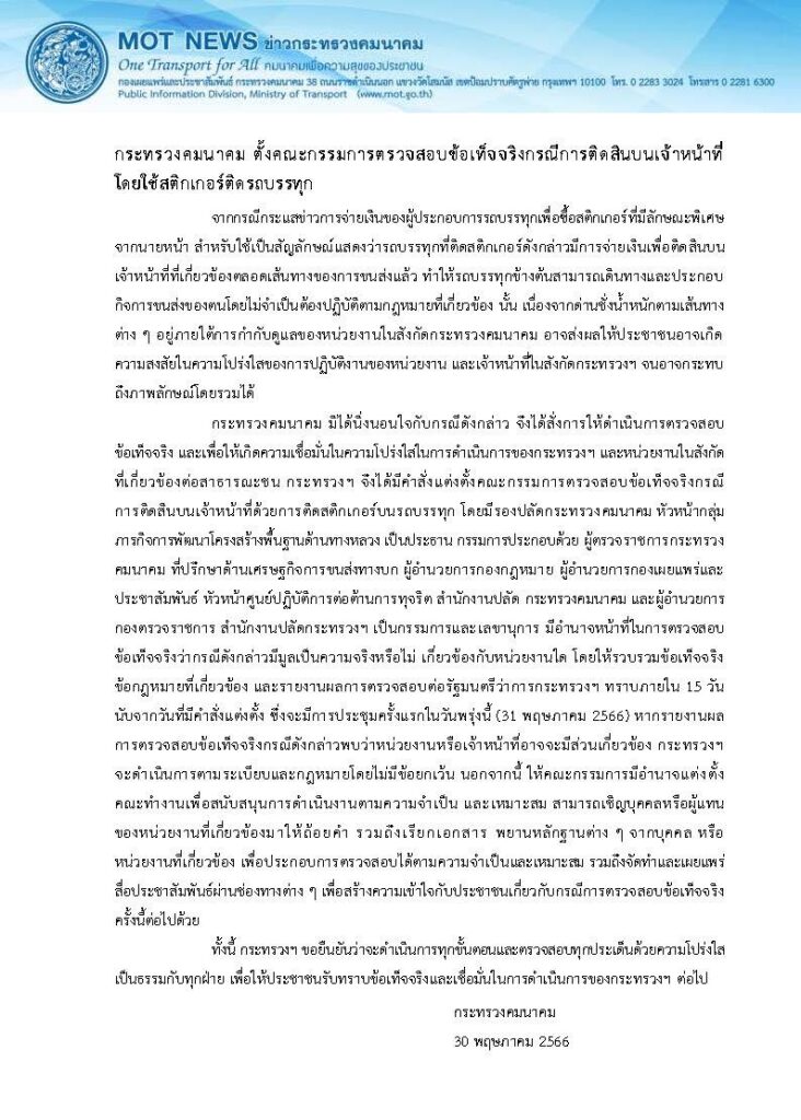 ในวันนี้กระทรวงคมนาคม ได้ออกเอกสารเผยแพร่ ระบุผู้บริหารกระทรวงคมนาคม มิได้นิ่งนอนใจกับกรณีดังกล่าว จึงได้สั่งการให้ดำเนินการตรวจสอบข้อเท็จจริง และเพื่อให้เกิดความเชื่อมั่นในความโปร่งใสในการดำเนินการของกระทรวงฯ และหน่วยงานในสังกัดที่เกี่ยวข้องต่อสาธารณะชน กระทรวงฯ จึงได้มีคำสั่งแต่งตั้งคณะกรรมการตรวจสอบข้อเท็จจริงกรณีการติดสินบนเจ้าหน้าที่ด้วยการติดสติกเกอร์บนรถบรรทุก